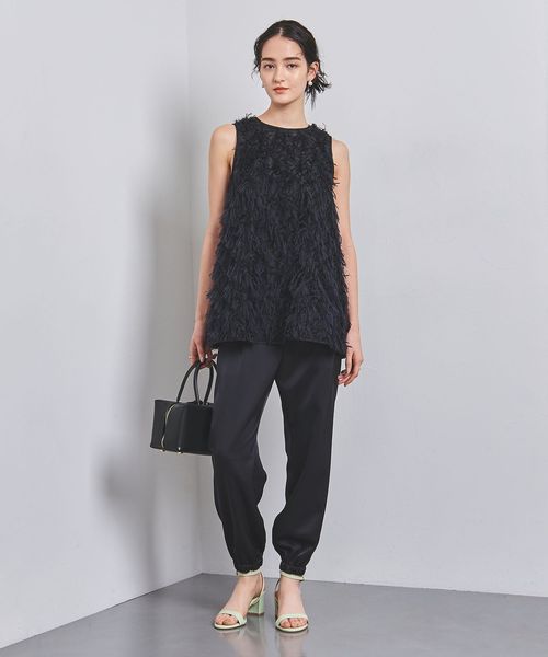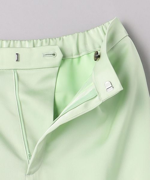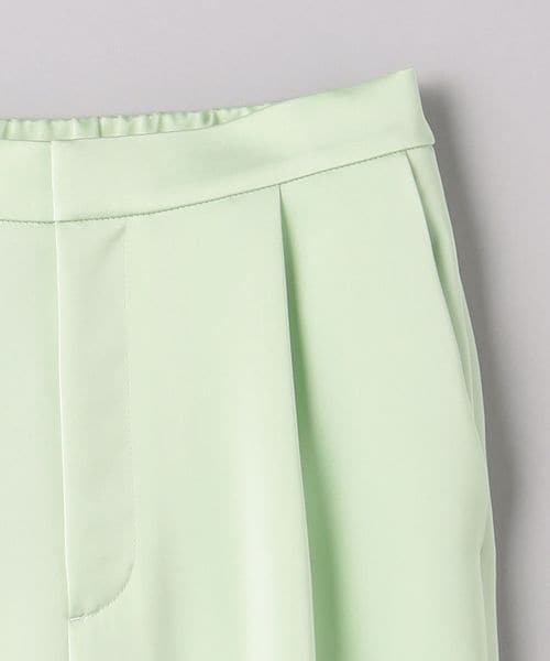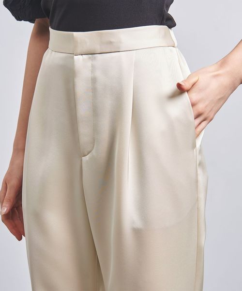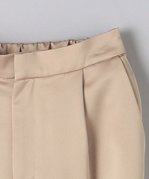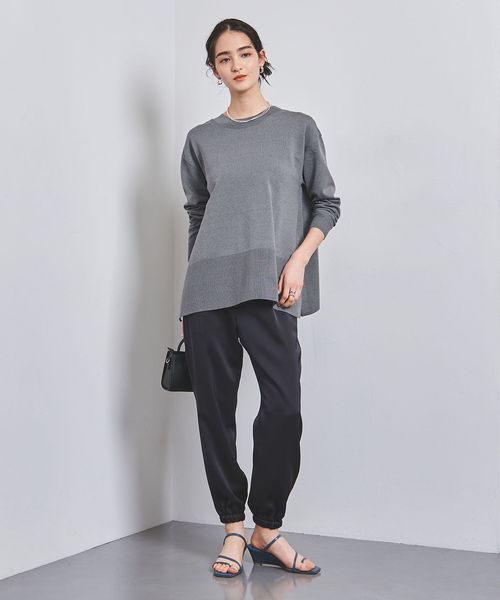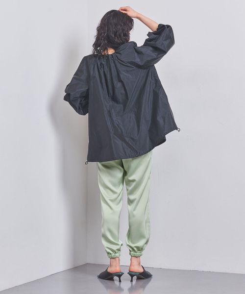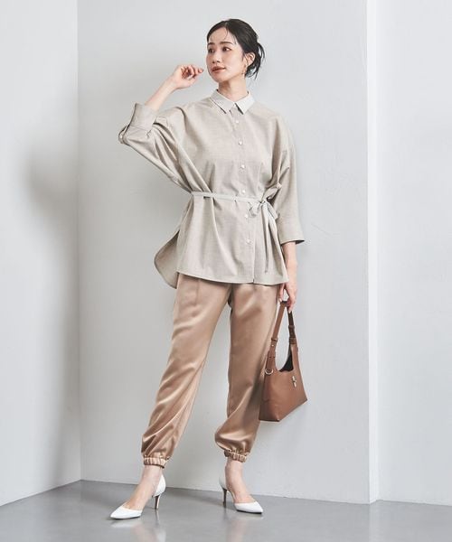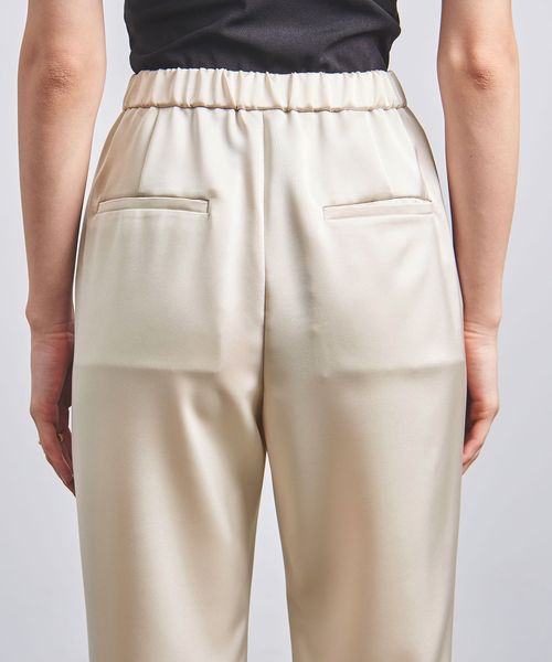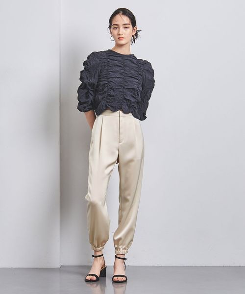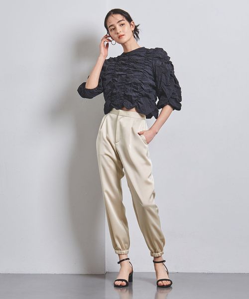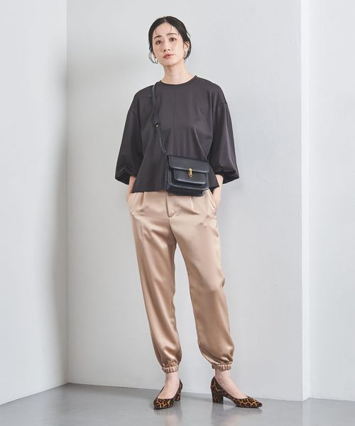 裾に平ゴムを入れた裾絞りのシルエットがややカジュアルな印象ながら、きれいめな素材を使用することで大人な印象に仕上たジョガーパンツ。
