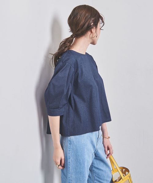 ハイウエストのボトムスとバランスの良いショート丈で、やや後ろ下がりになったニュアンスのあるシルエットです。