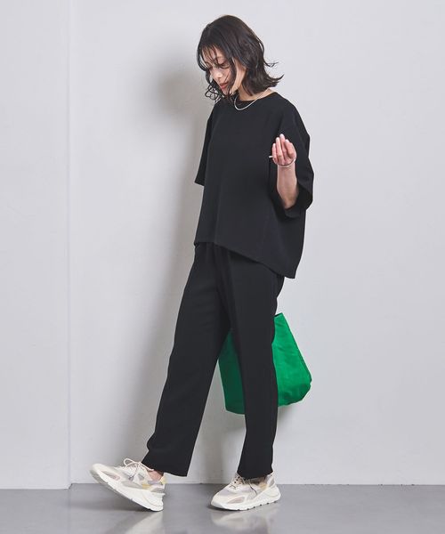 スラックスパンツとのマニッシュな合わせで都会的な印象に。