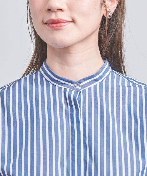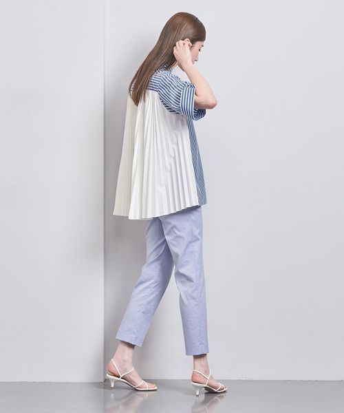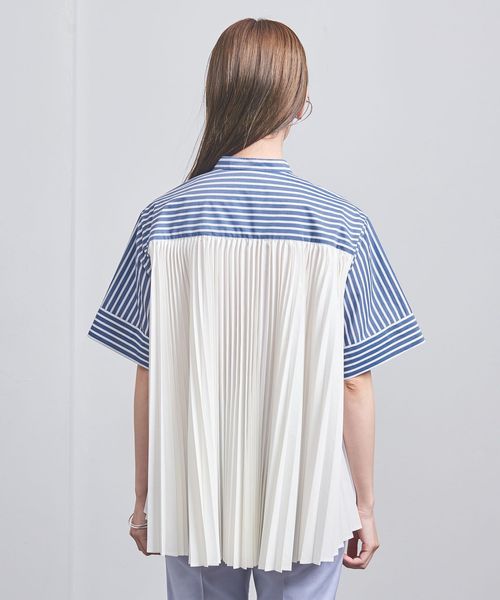 ストライプと無地プリーツのコンビが魅力的なブラウス