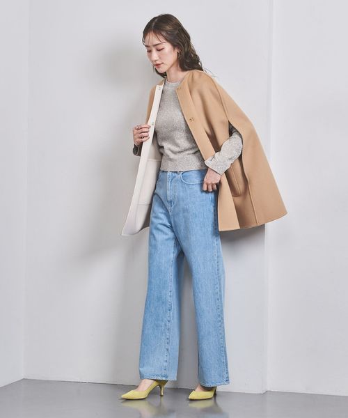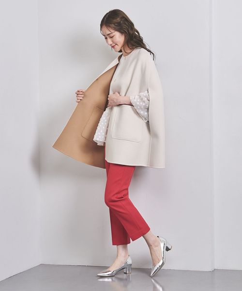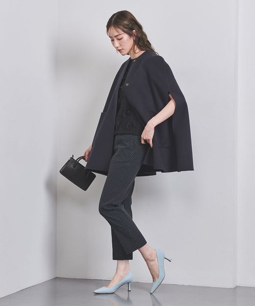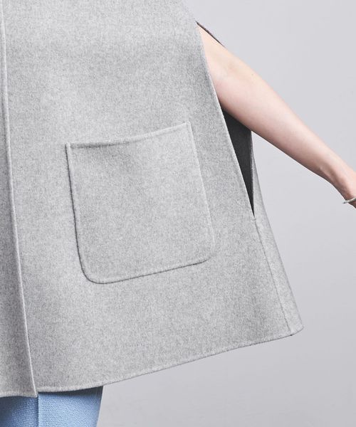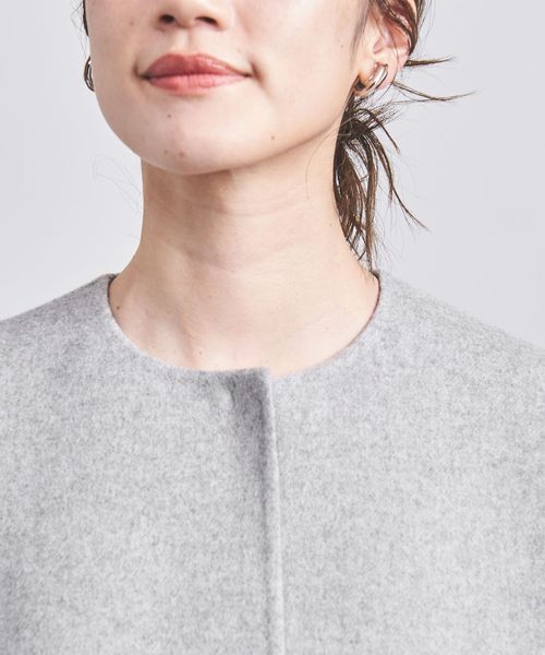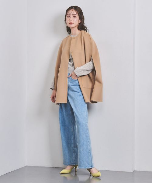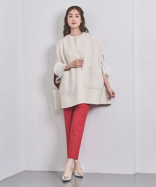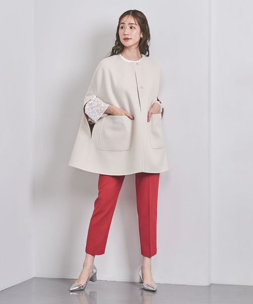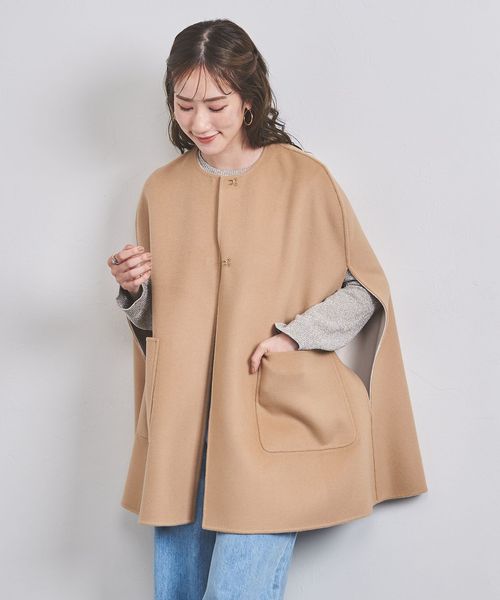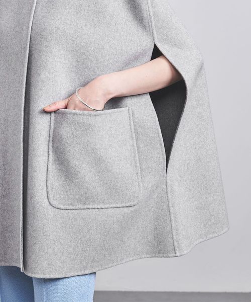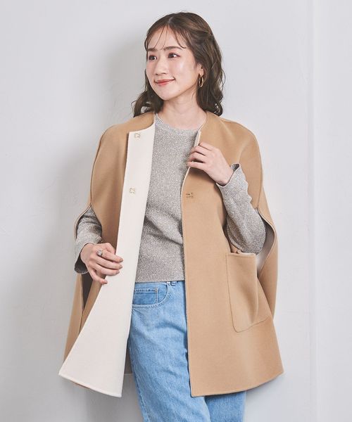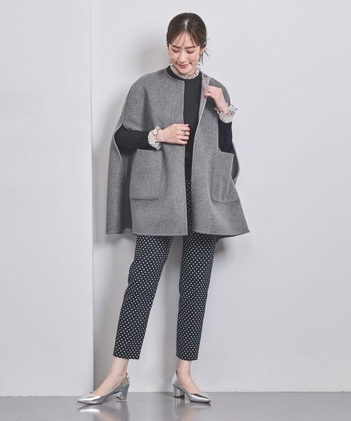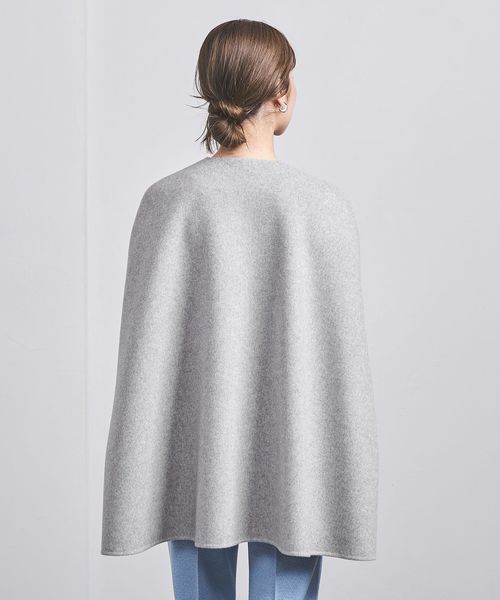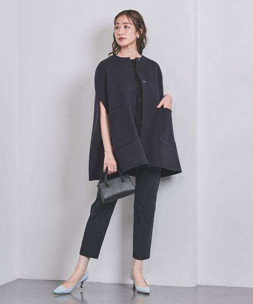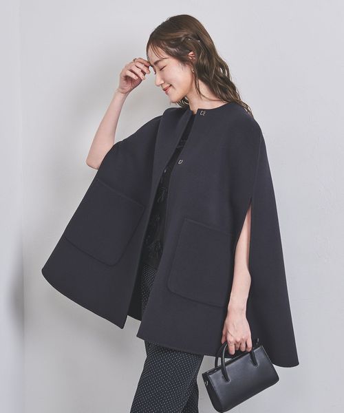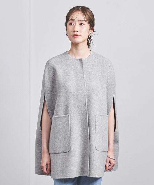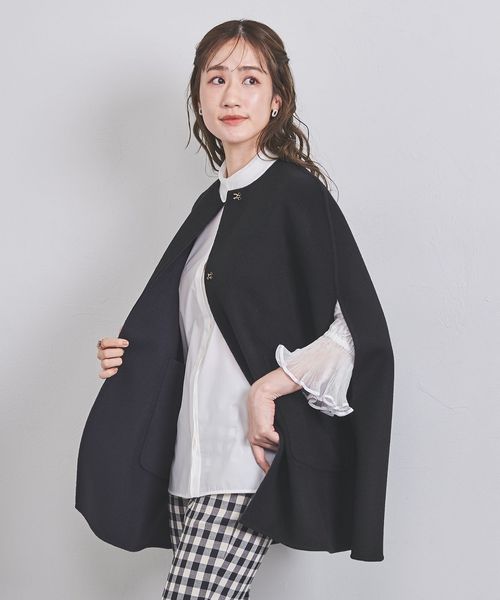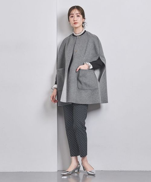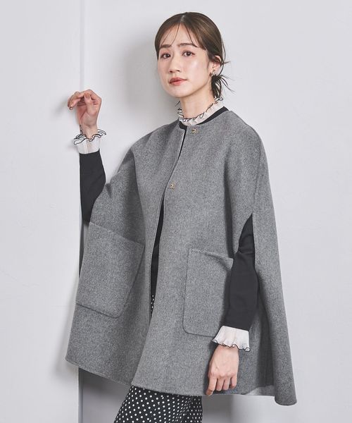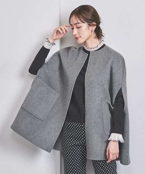 シンプルなノーカラーとシーズン手前から着やすいミドル丈が魅力の上品なケープコート。