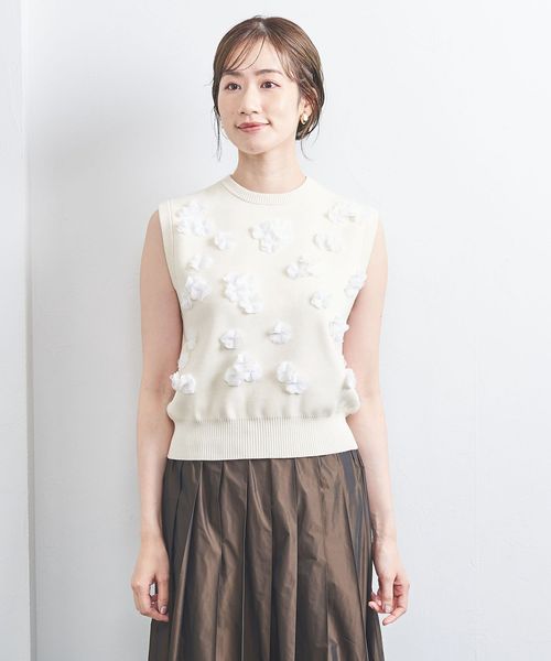 立体的な花の装飾をちりばめたベストにもなるノースリブニット