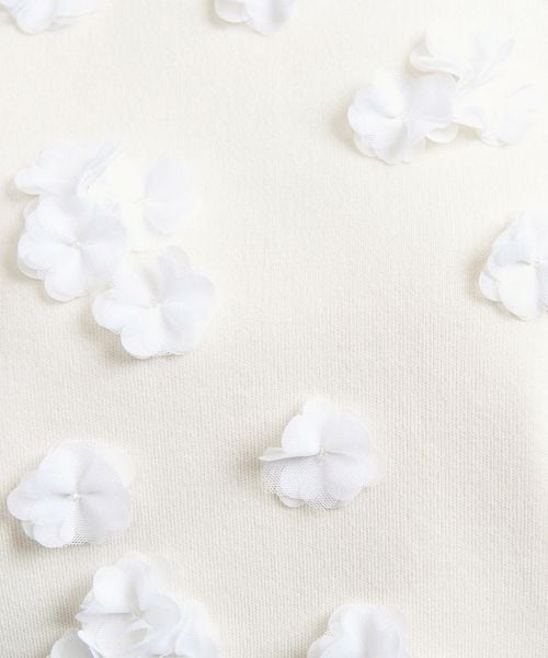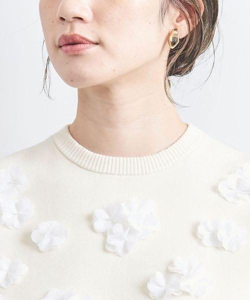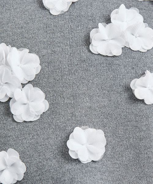 チュールとジョーゼット素材をカットして立体感のあるフラワーモチーフを前身頃にほどこした華やかな印象のニット。