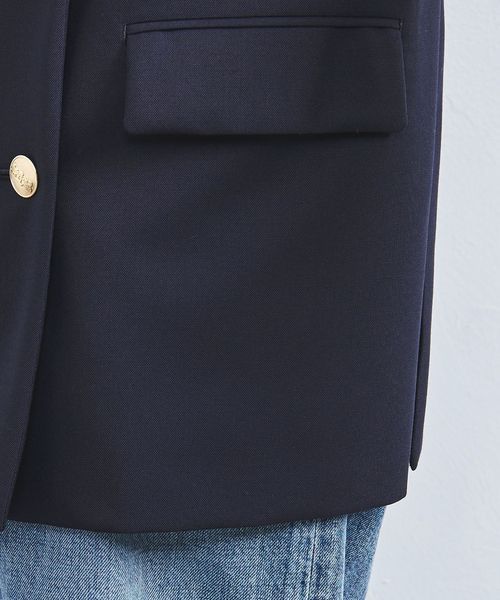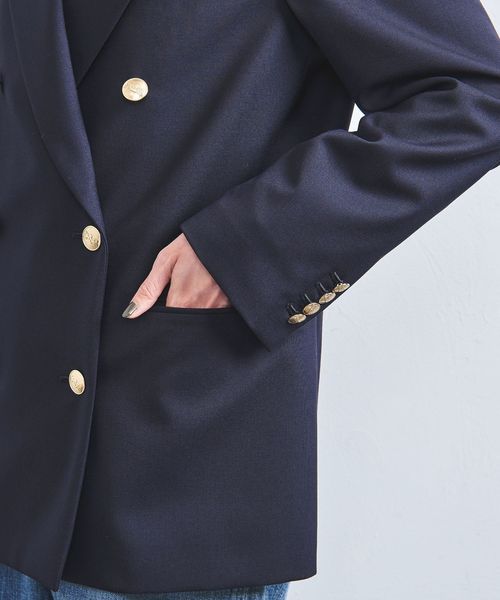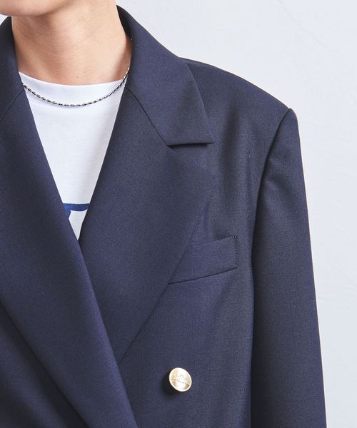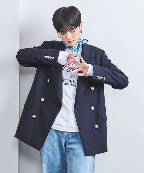 上品なダブルブレストブレザーはデニムやカットソーなどカジュアルなアイテムとも好相性。