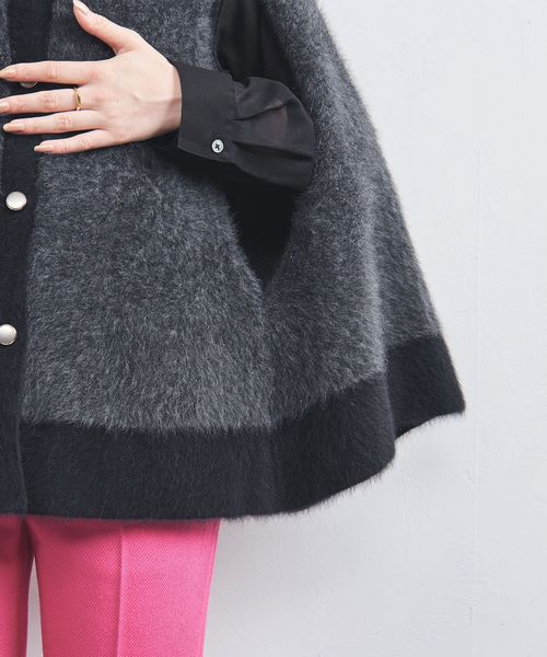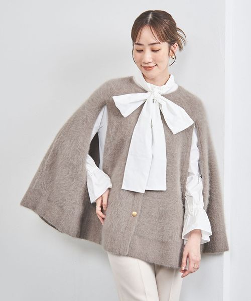 肩の凝らない軽さが魅力のニットケープは季節の変わり目におすすめのアイテム。