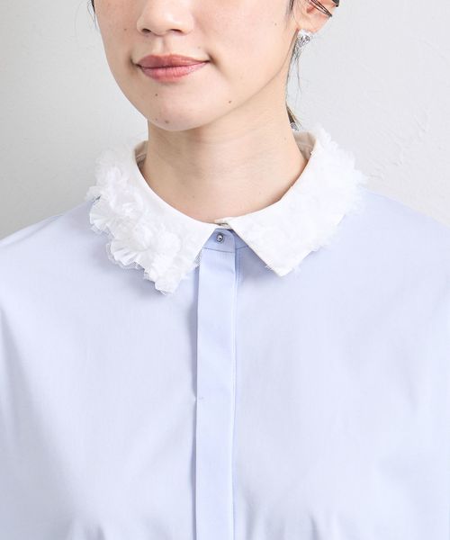 立体的な付け襟が顔周りを華やかにし、アクセサリーがなくても女性らしく明るい印象に。