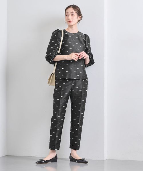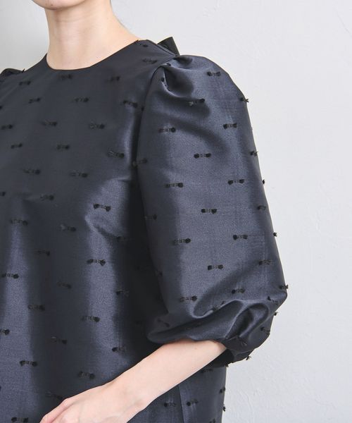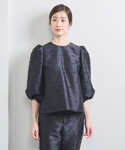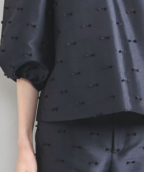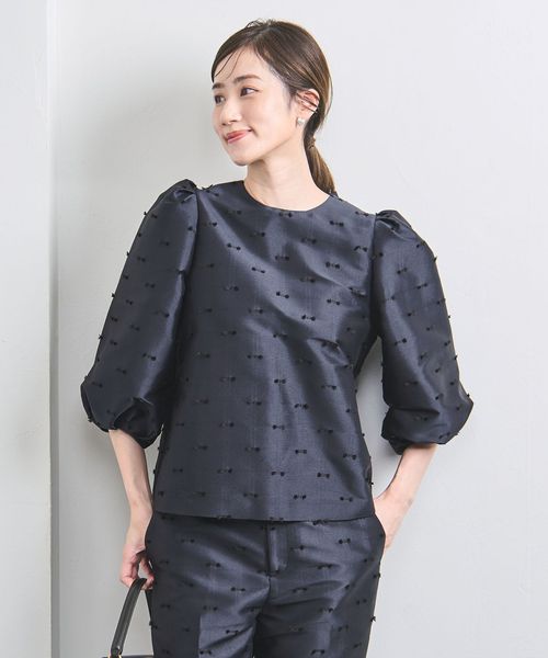 肩幅は狭めで、肩上からのタックボリュームスリーブが華やかな印象のブラウス。
