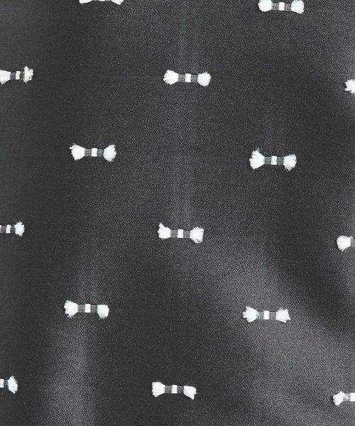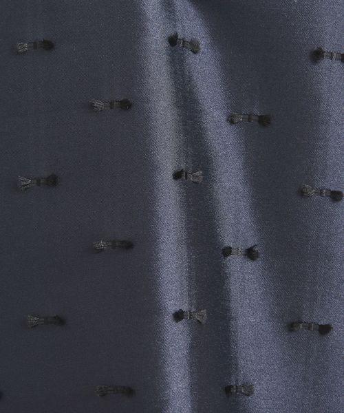 光沢感のある厚地のポリエステルサテンベースに、ウーリー糸でリボンのように表現したカットジャガード。
