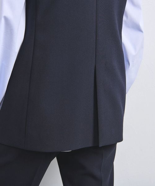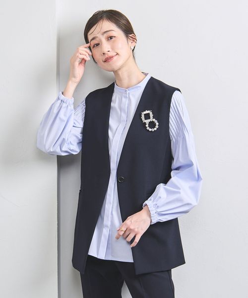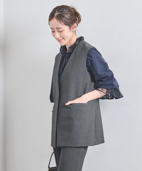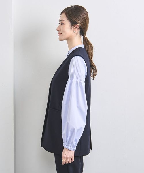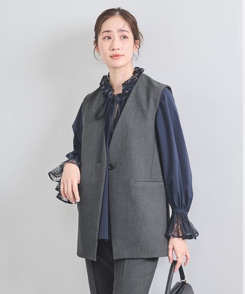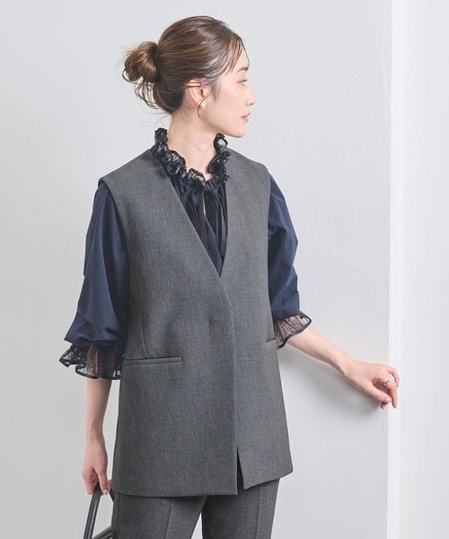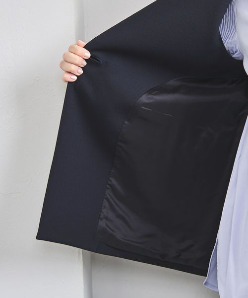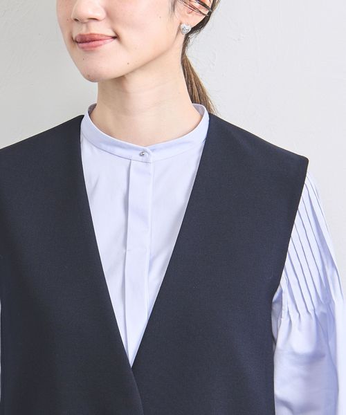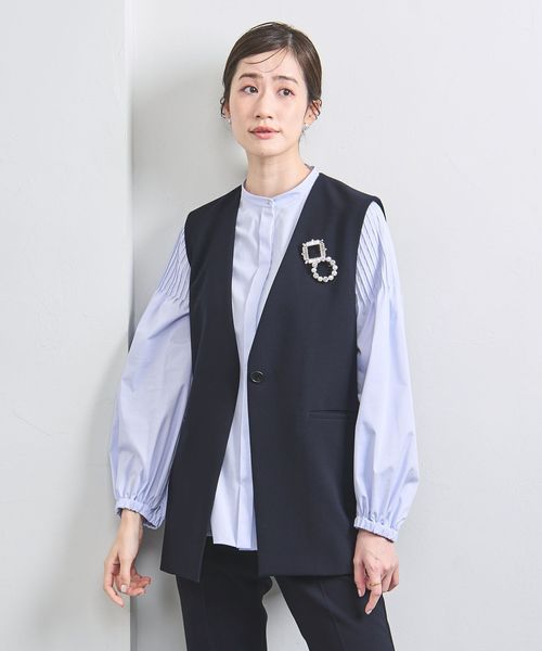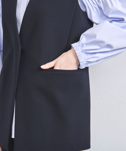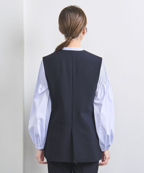 フロントは比翼仕立ての1つボタンで、ウエストの絞りを緩やかにしたボックスシルエットのベスト。