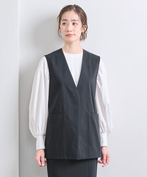 フロントは比翼仕立ての1つボタンで、ウエストの絞りを緩やかにしたボックスシルエットのベスト。