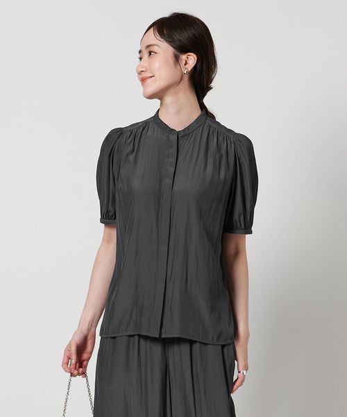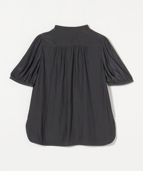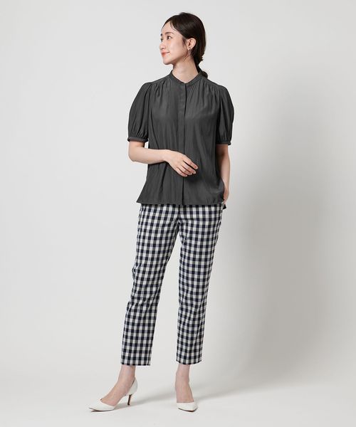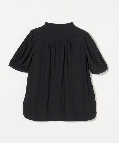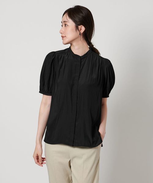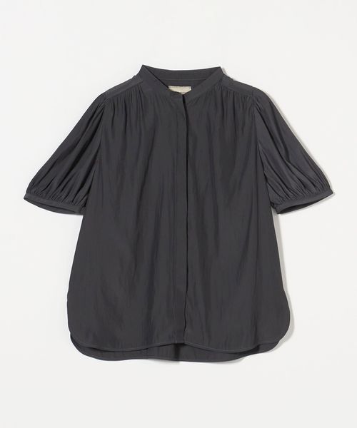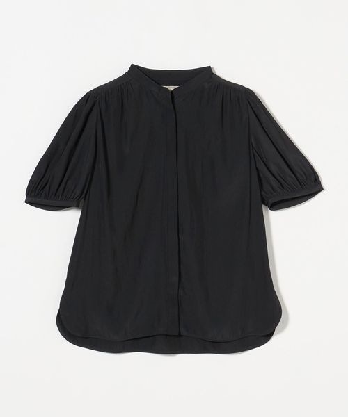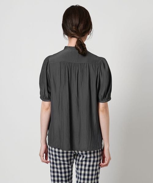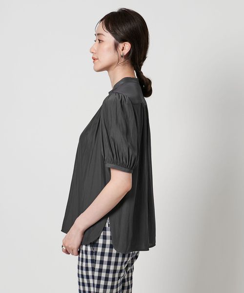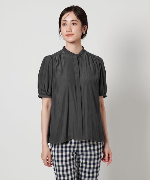 肘上丈のショートスリーブでバンドカラーと比翼の前立てがすっきりとした印象のブラウスです。