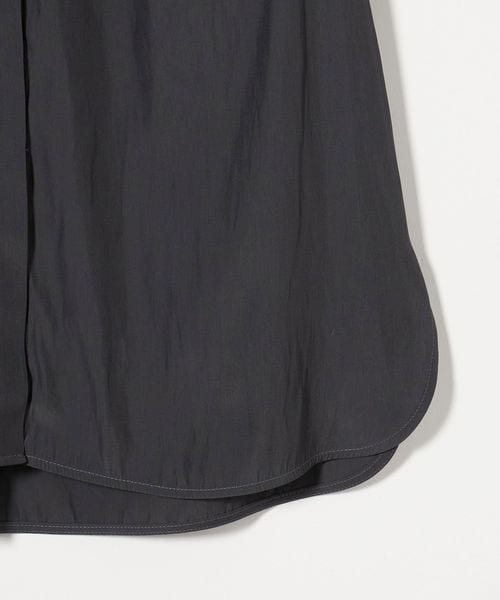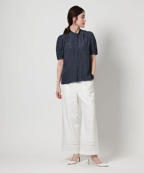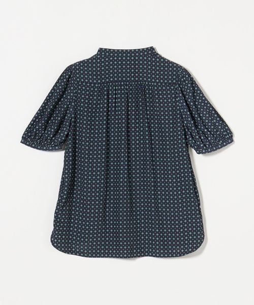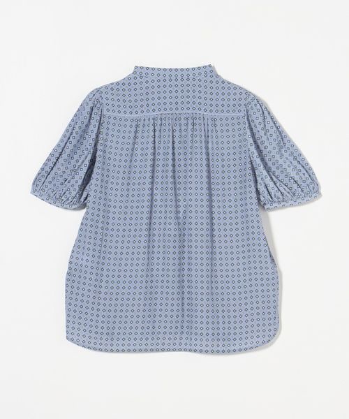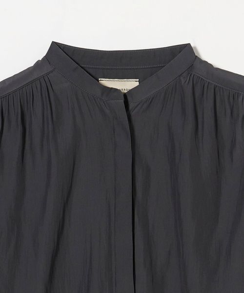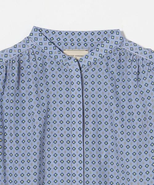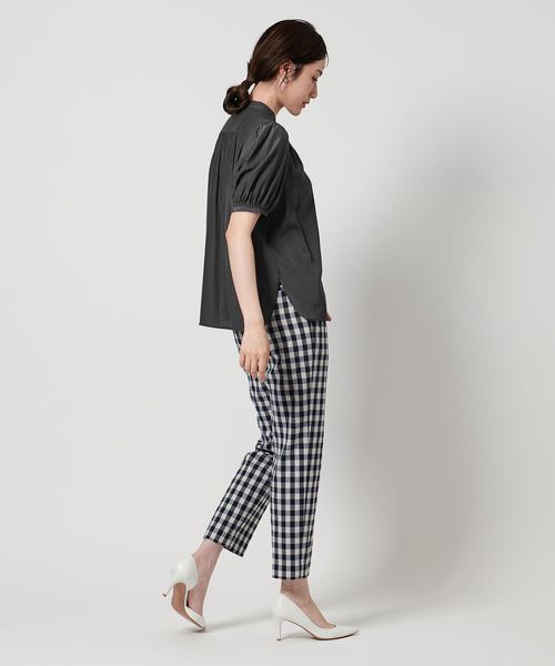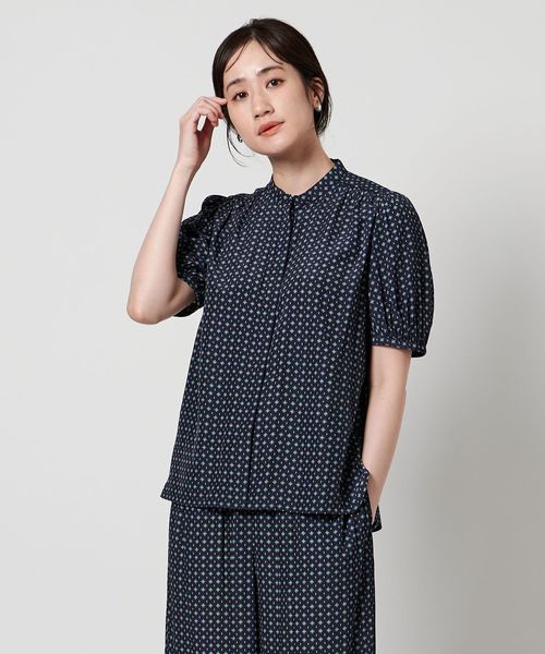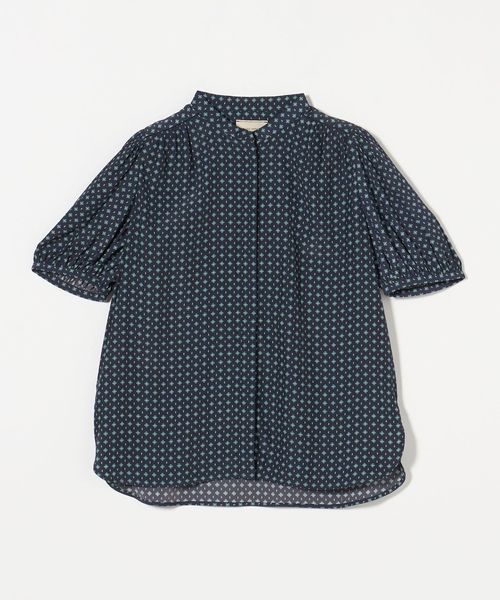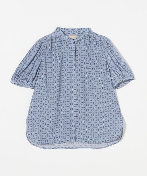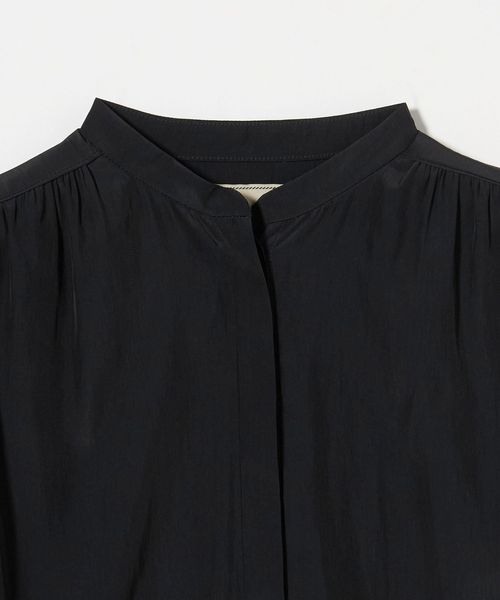 肘上丈のショートスリーブでバンドカラーと比翼の前立てがすっきりとした印象のブラウスです。