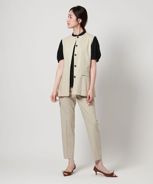 同素材パンツとセットアップでの着こなしはもちろん、単品使いでワイドパンツやテーパードパンツとの合わせもおすすめです。