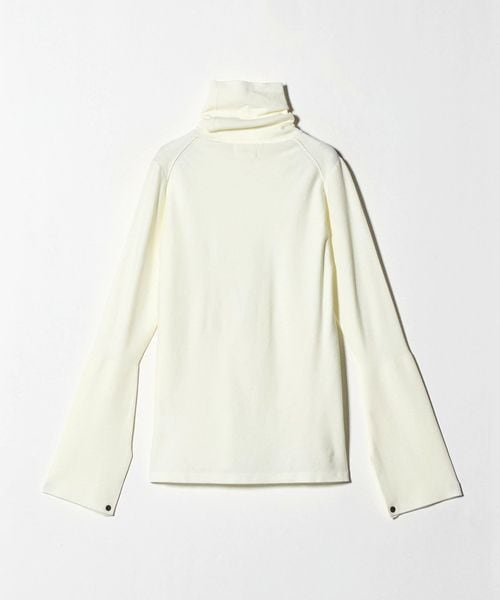 ほどよくゆとりを持たせたシルエットに、優しく首元を包むハイネック、ボタンで開閉可能なベルスリーブがポイントです。