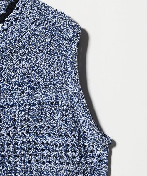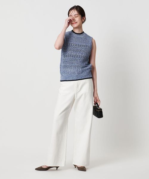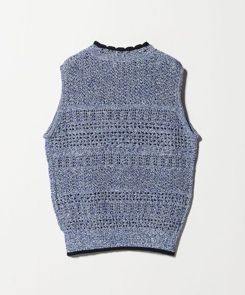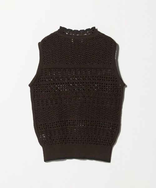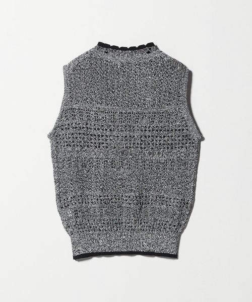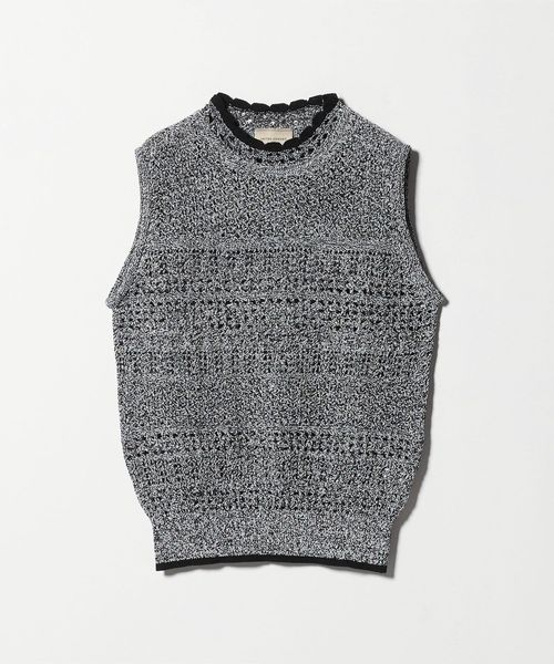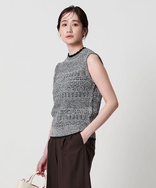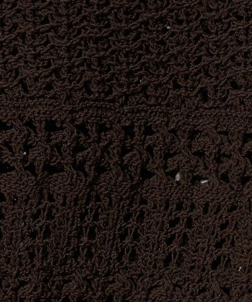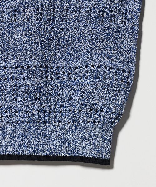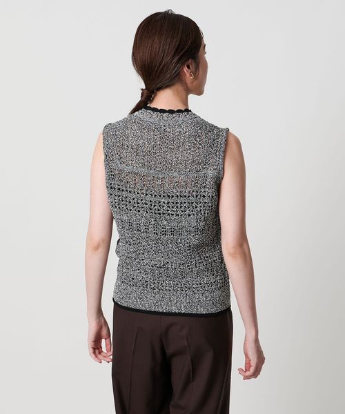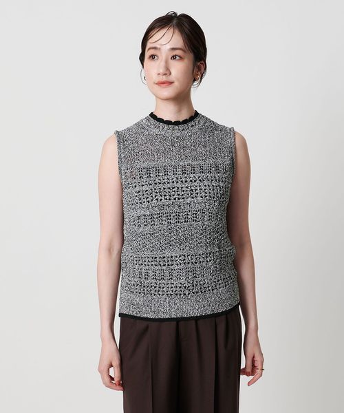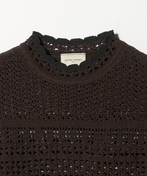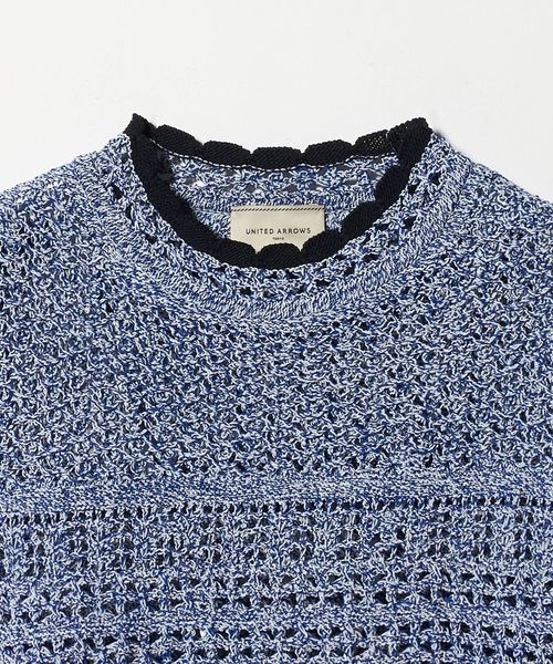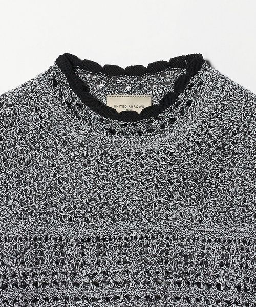いろいろな透かし模様を組み合わせたデザインのニットトップス。
