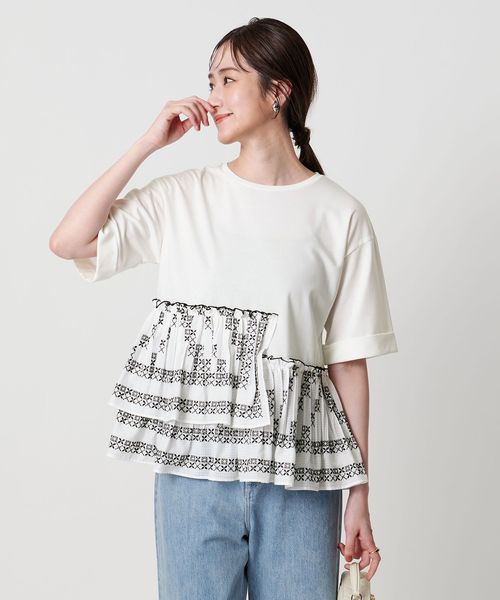立体感のある刺繍とプリーツが魅力のペプラムTシャツ