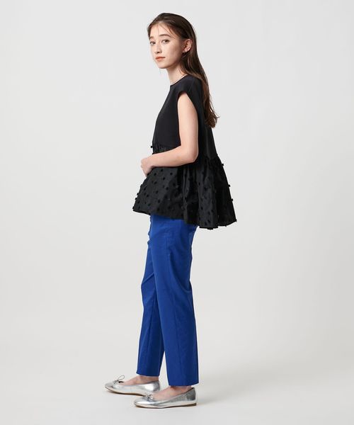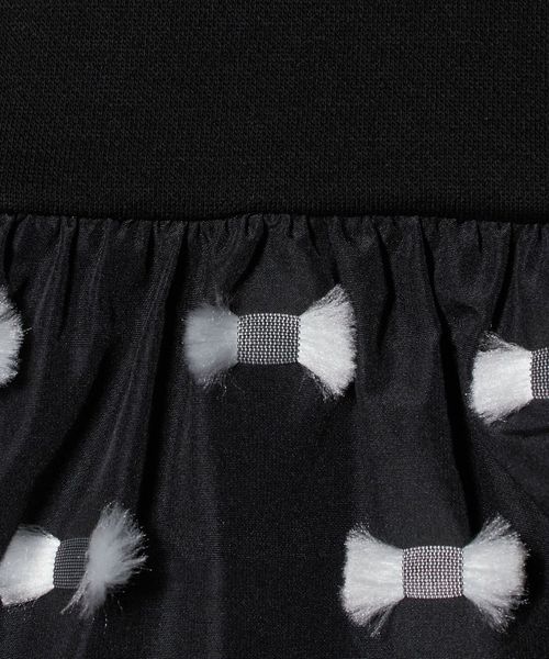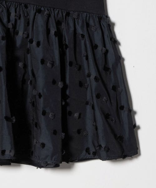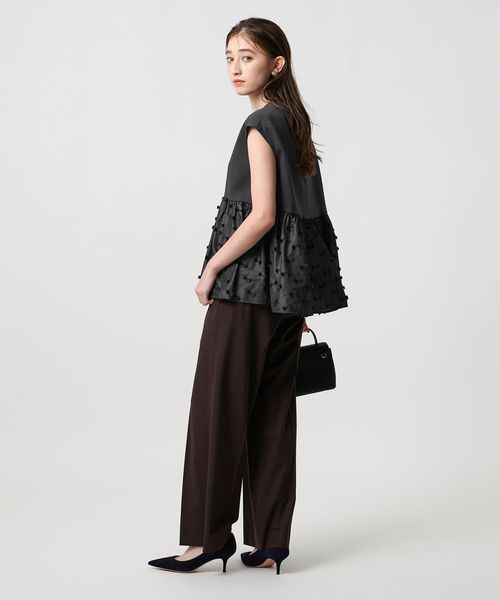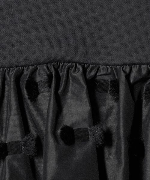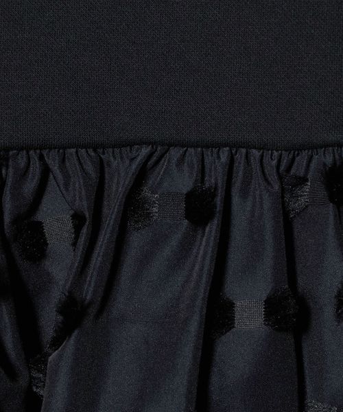 ペプラム部分は、ポリエステルタフタにふっくらとしたウーリー糸を重ね重ね打込み、立体的なリボン形状を表現したカットジャガード素材。