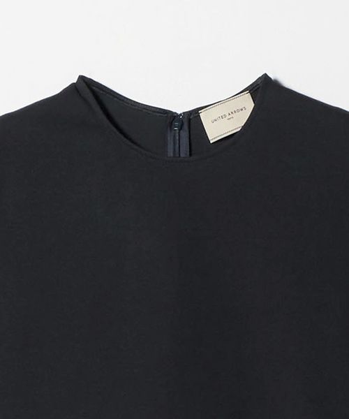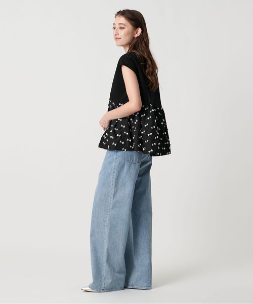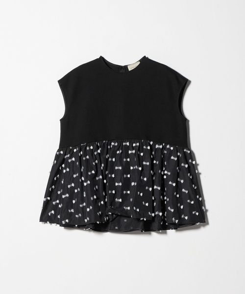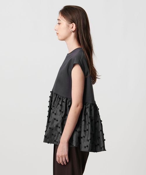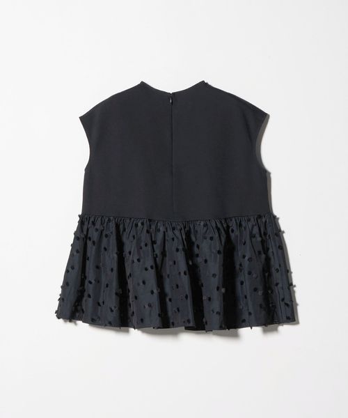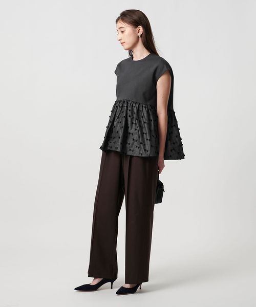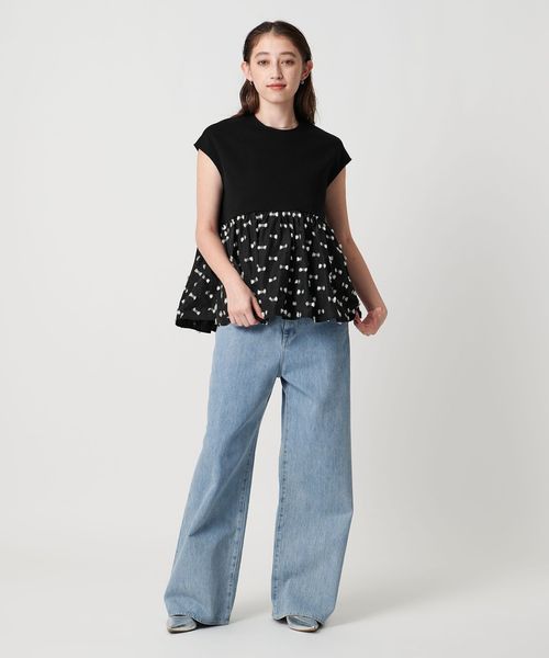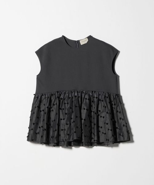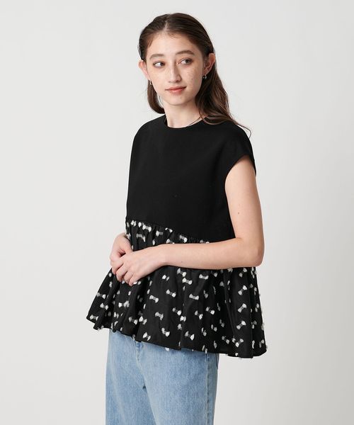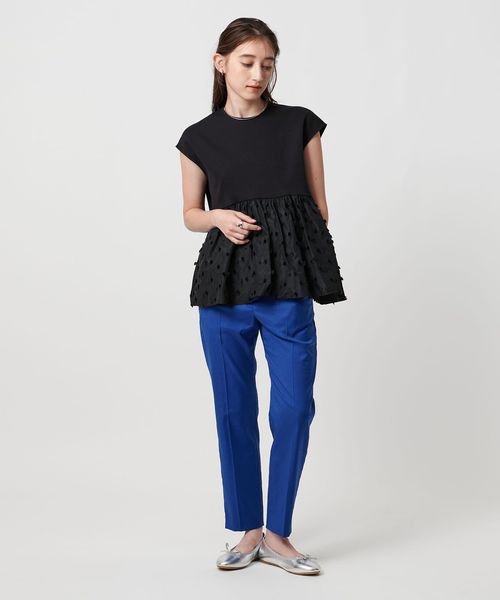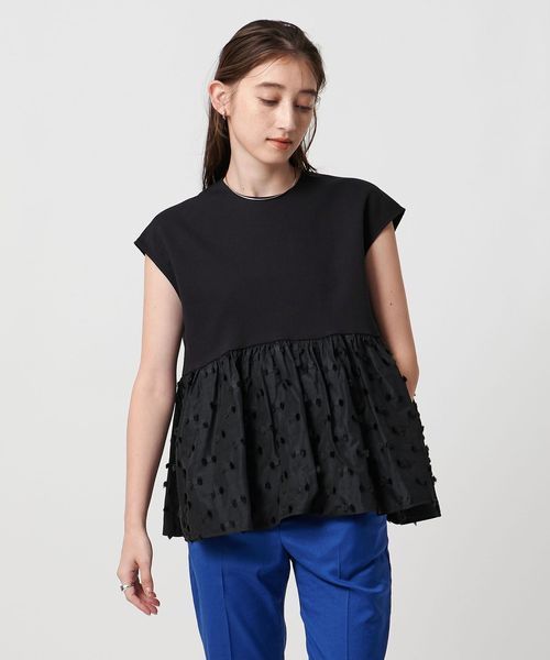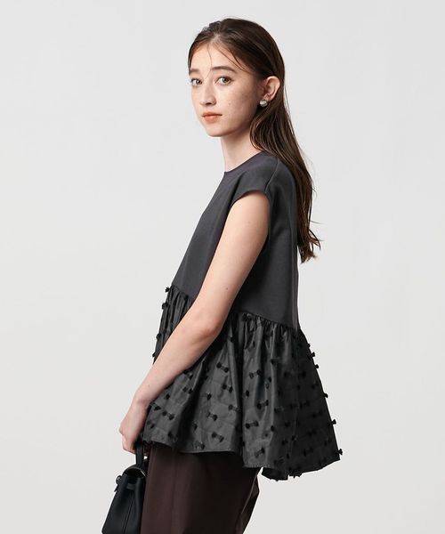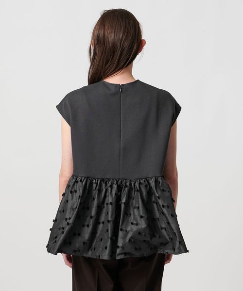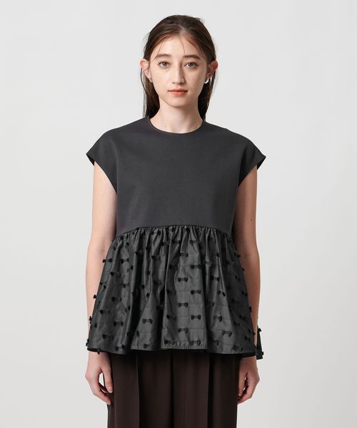 やや肩先の隠れるフレンチスリーブとラウンドライン切替のペプラムシルエットが女性らしい印象のコンビトップス。