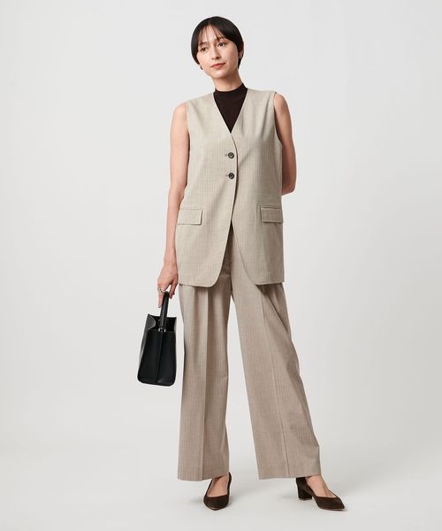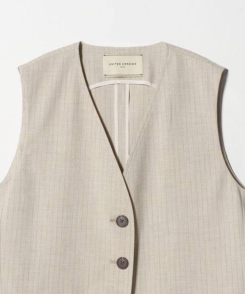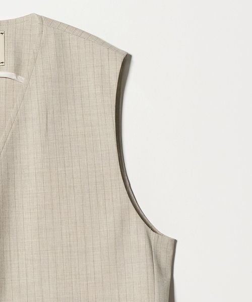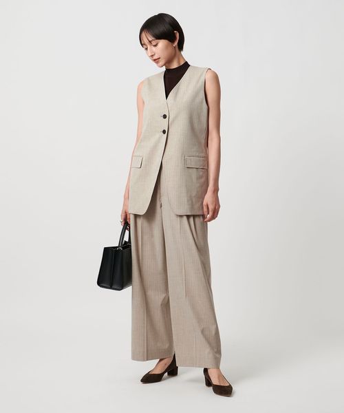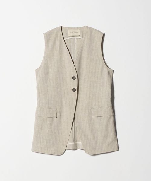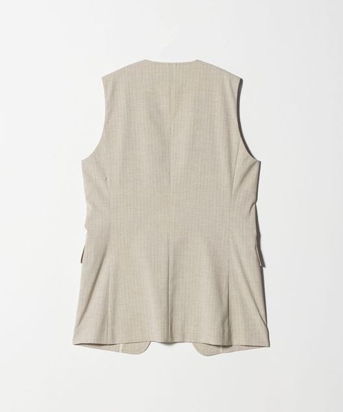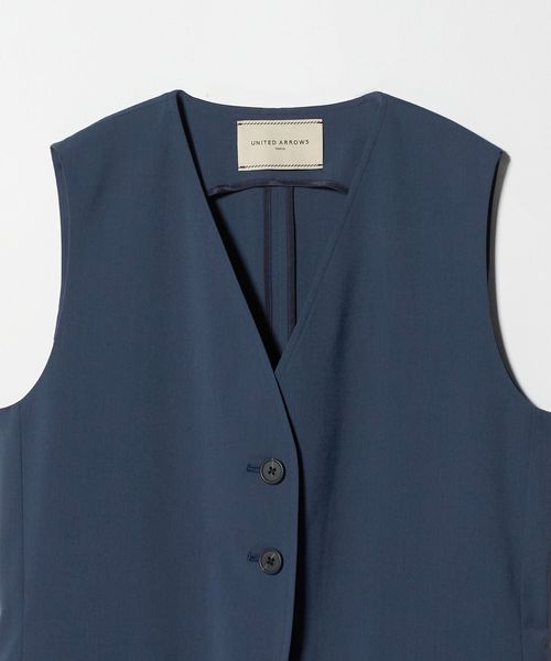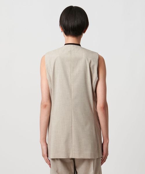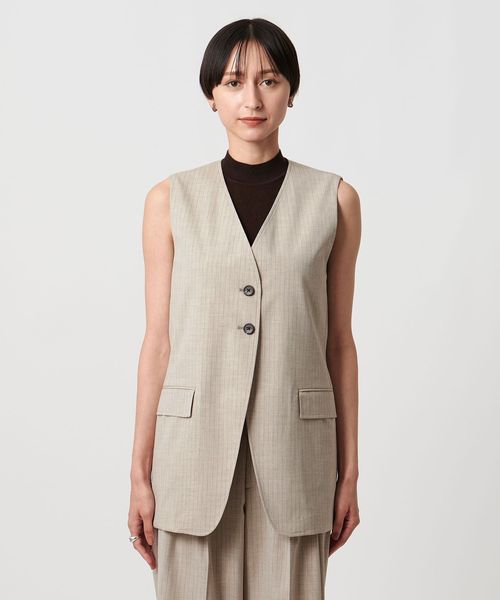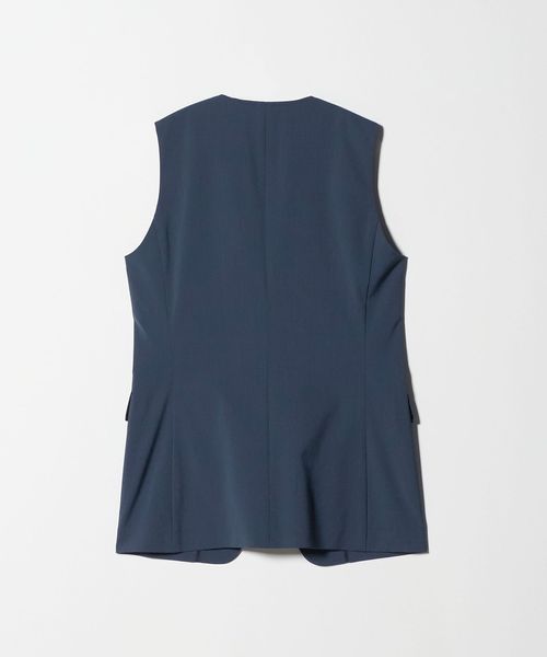 Vネックノーカラーでスッキリとマニッシュな印象を演出するミドル丈のベスト。
