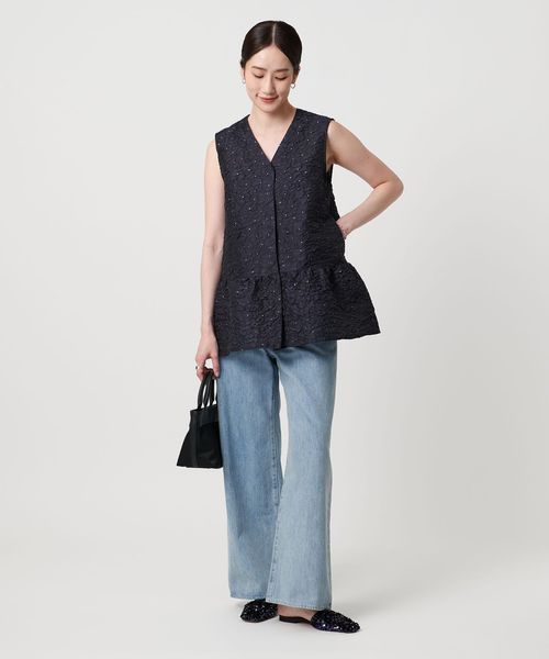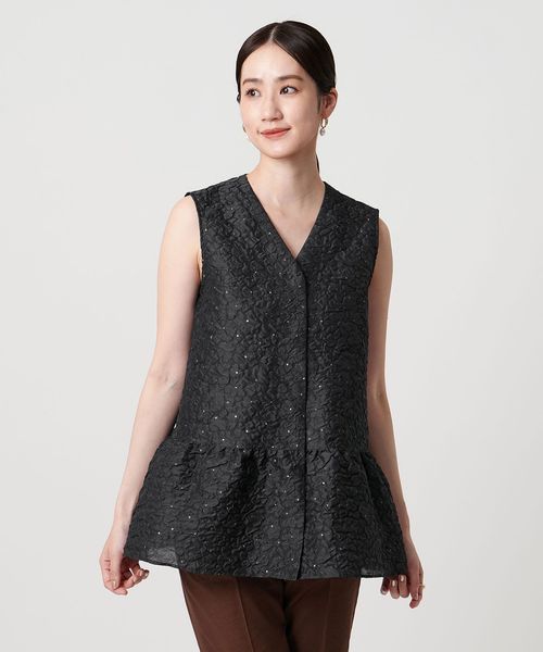丈下に切り替えを施したペプラムディテールが、立体的で華やかなシルエットを演出するベスト。