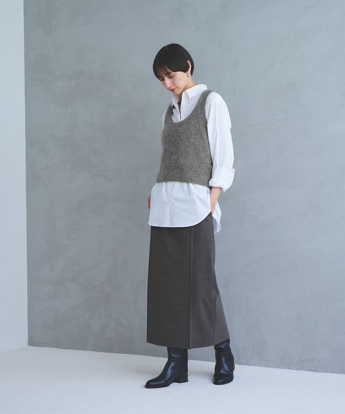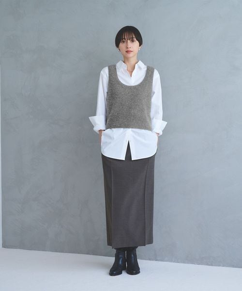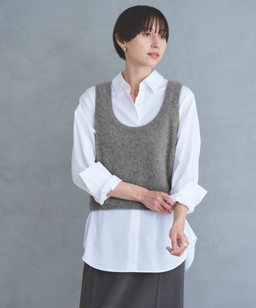 襟元浅めを前に一枚着はもちろん、シャツなどの上に重ねて細身ボトムとの合わせもおすすめです。