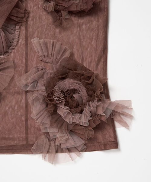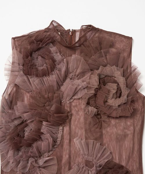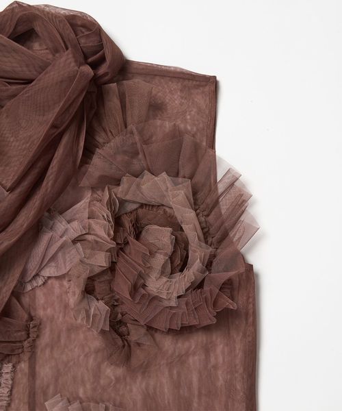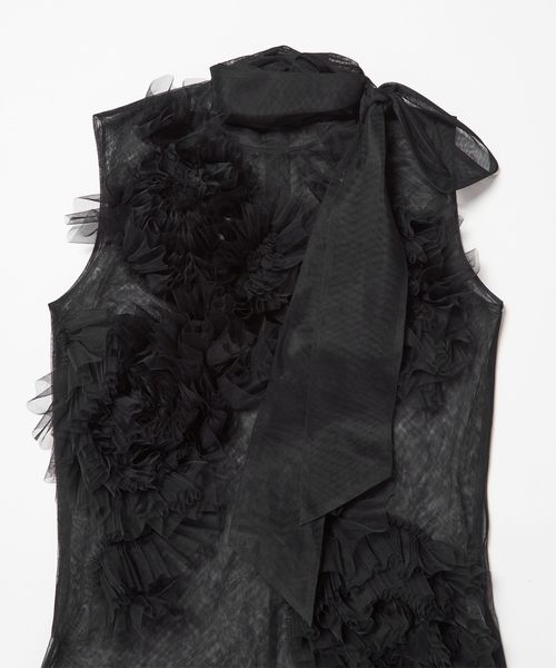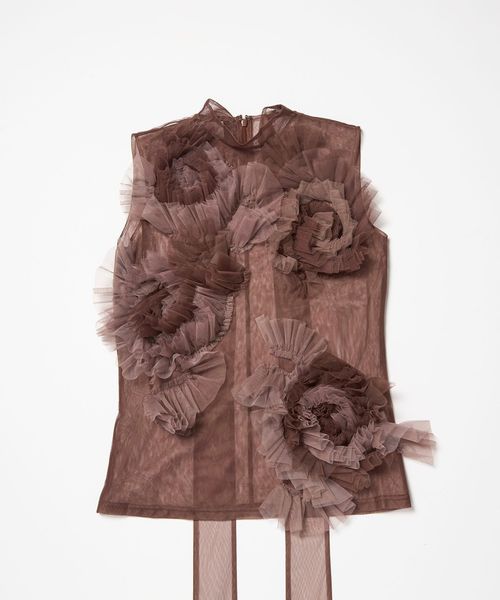 大ぶりなチュール素材のフラワーモチーフが目を惹く、華やかなノースリーブトップス。
