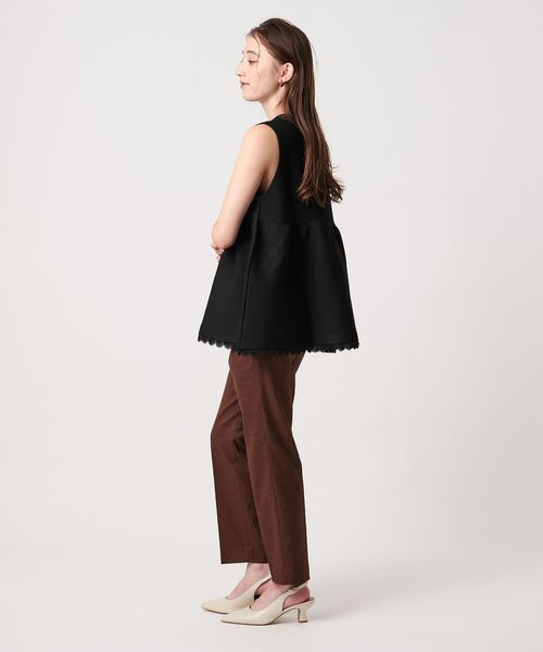 落ち感のあるパンツと合わせて、ペプラムデザインが映えるコーディネートがおすすめ。