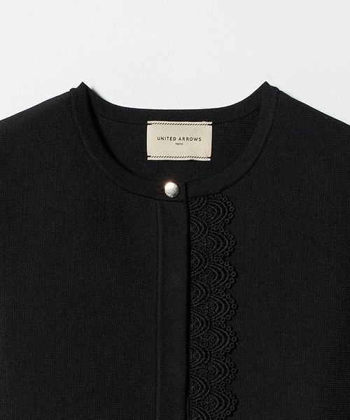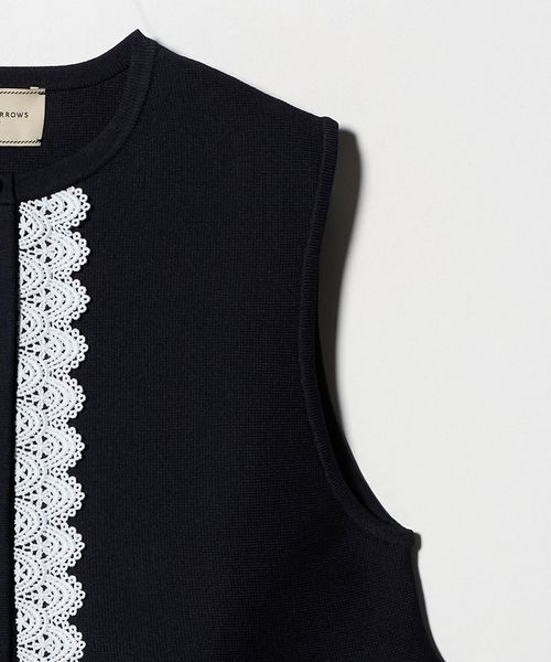 フロント片側と裾周りにあしらわれたオリジナルのレーステープが華やかな印象を演出するベスト。