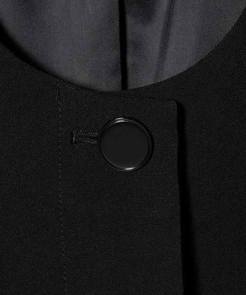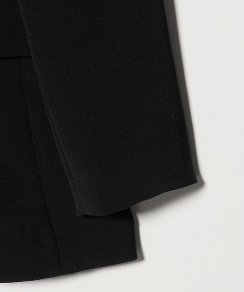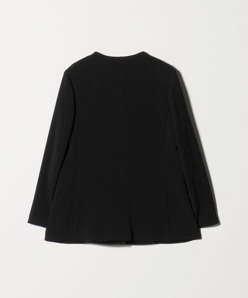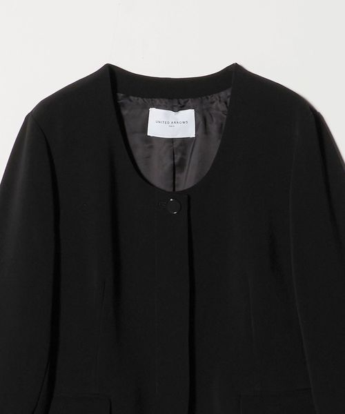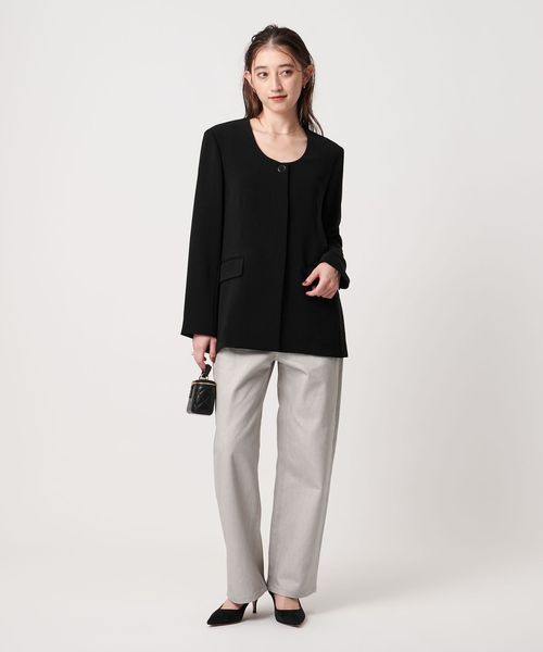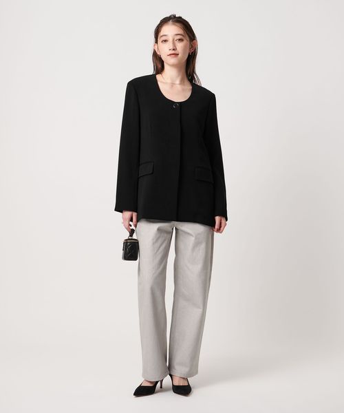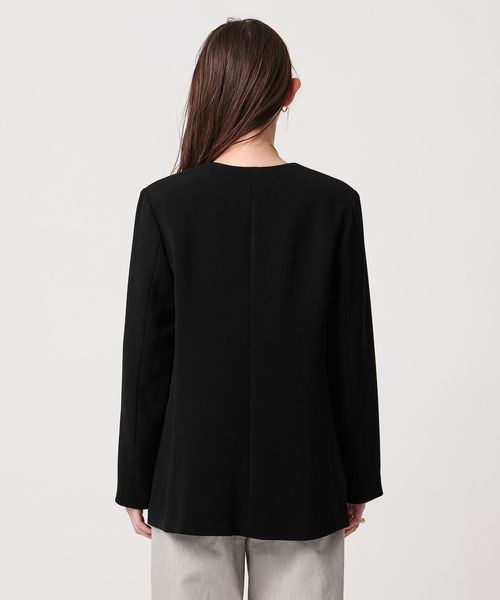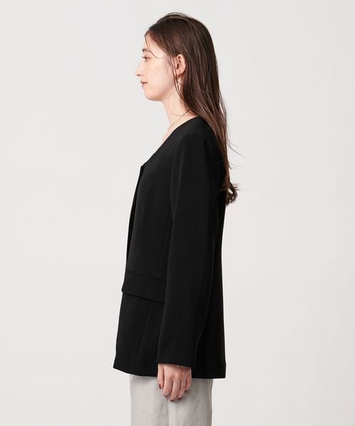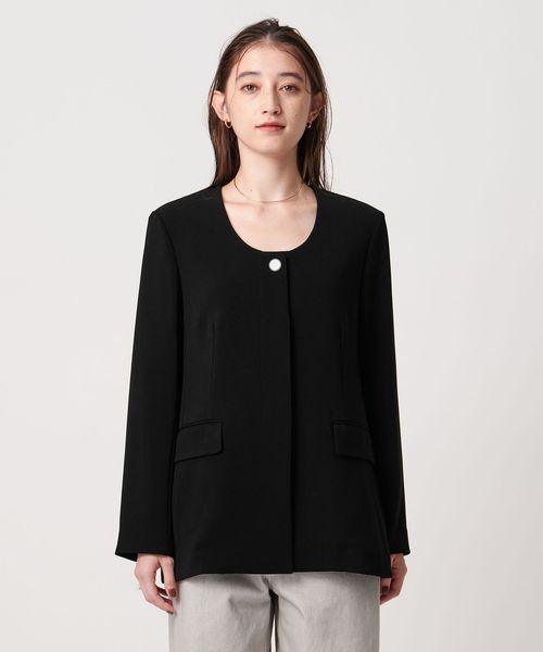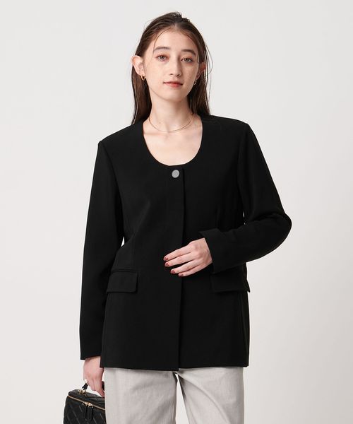 すっきりと開いたUネックラインと細身のシルエットが、女性らしさを引き立てるジャケット。