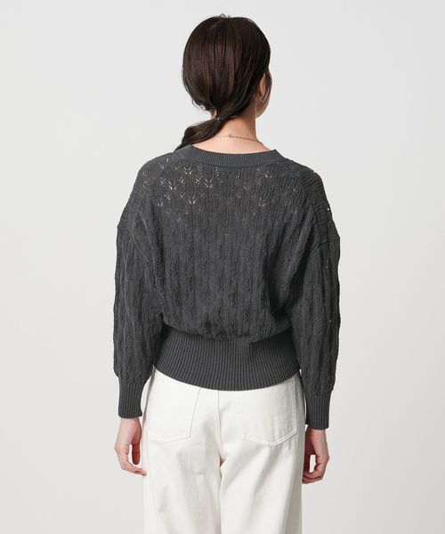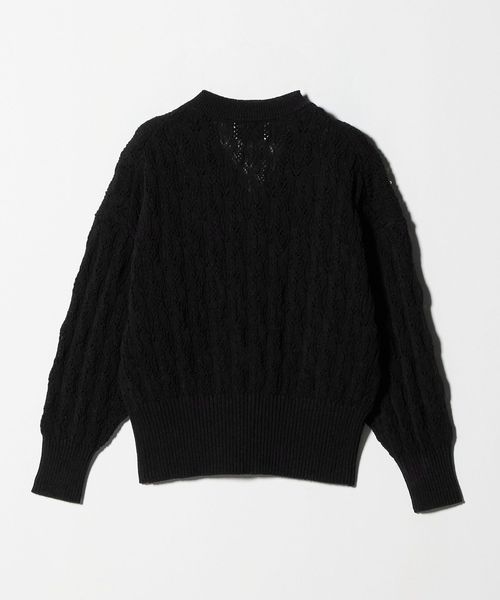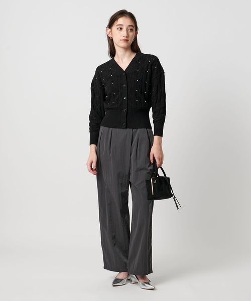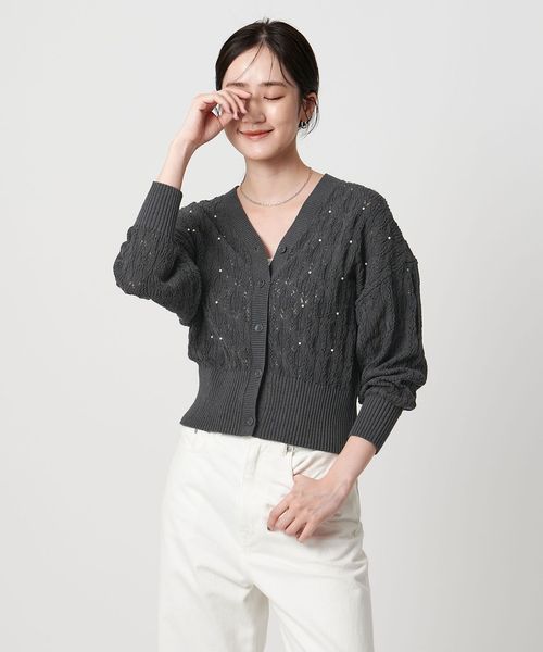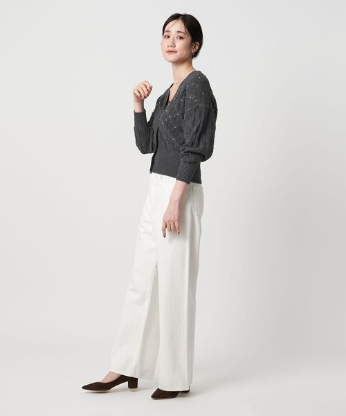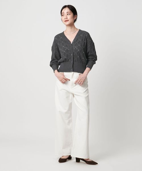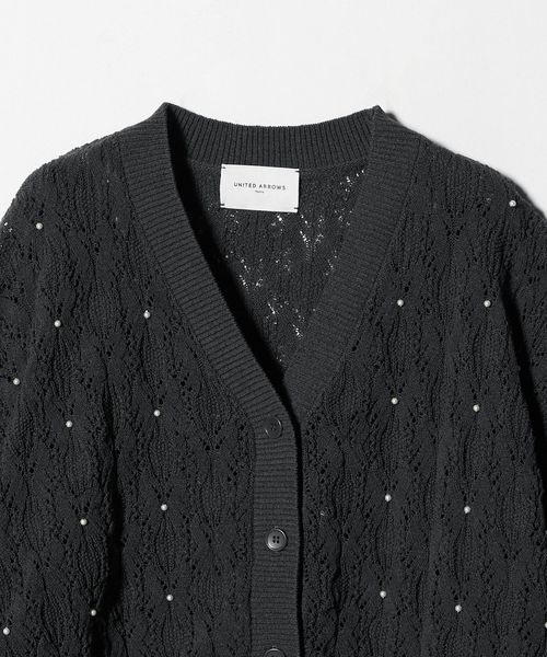 表情豊かな編地に、フェイクパールのパーツが華やかさをプラスするカーディガン。
