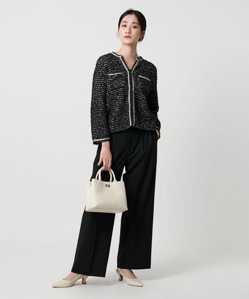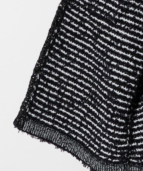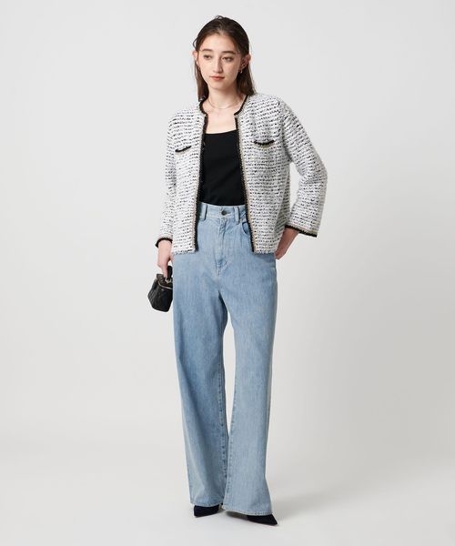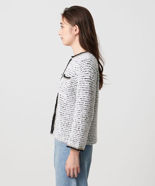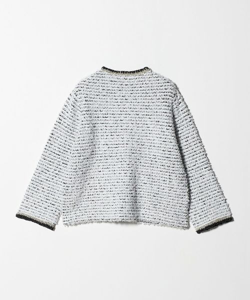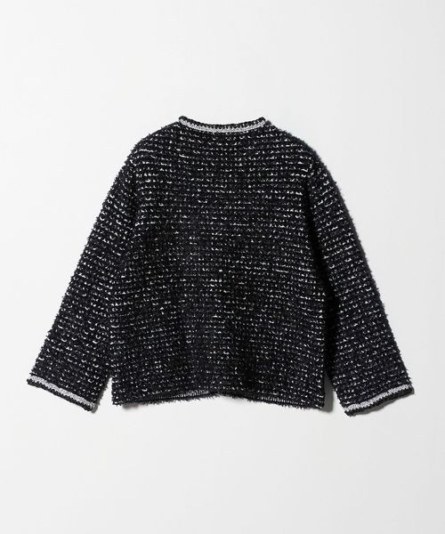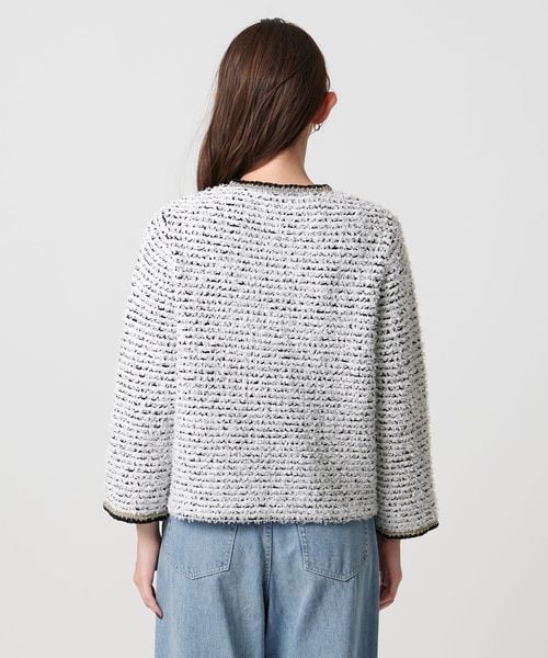 かぎ針のトリミングがアクセント。さらりと羽織れるツイードニット