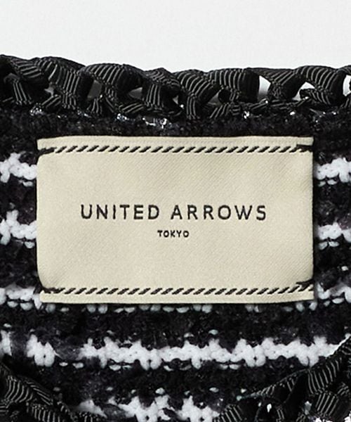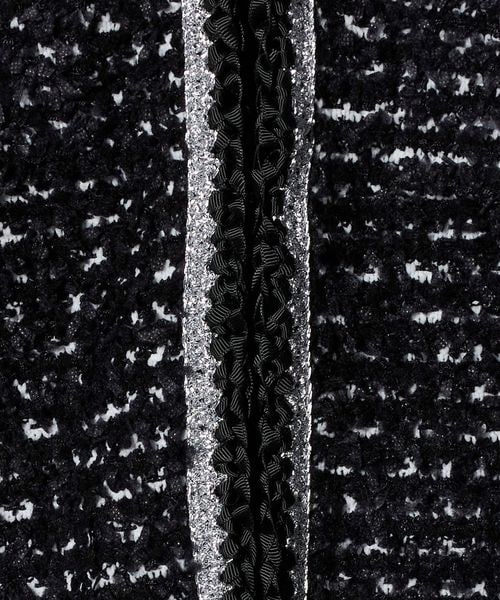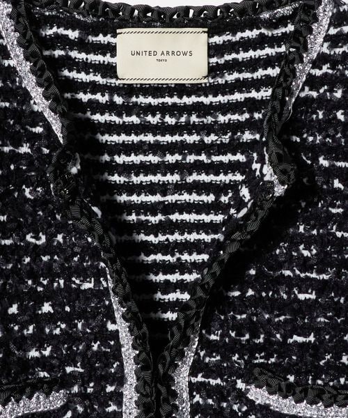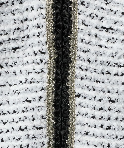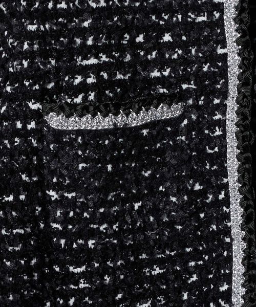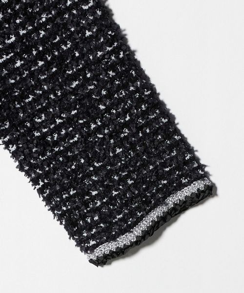 グログランテープとラメコード糸を使用して、かぎ針でトリミングを施したツイードニット。