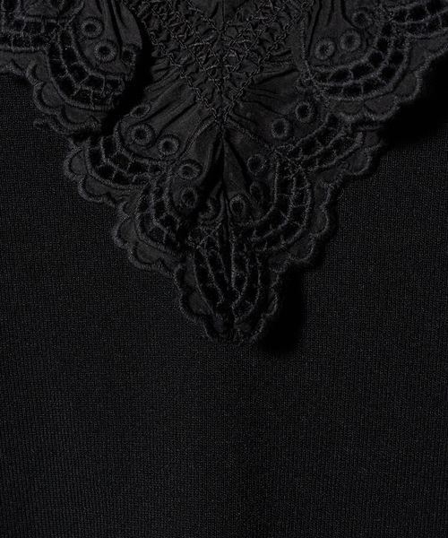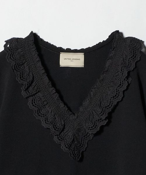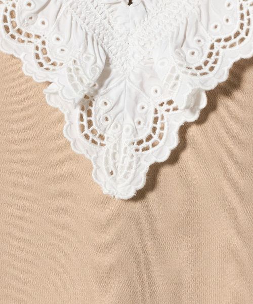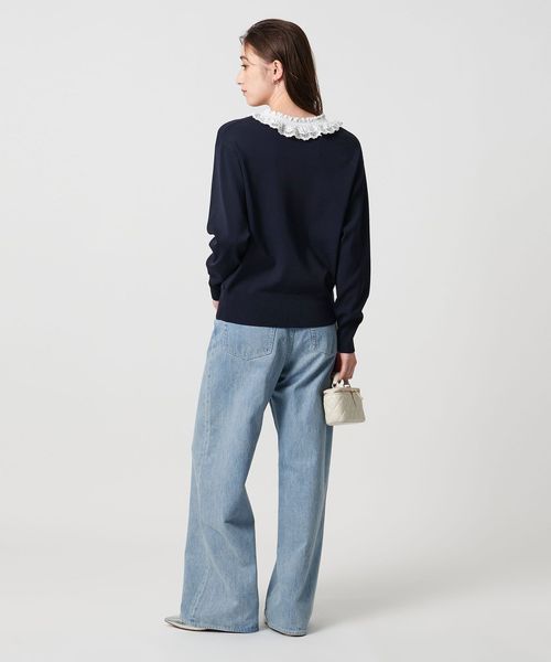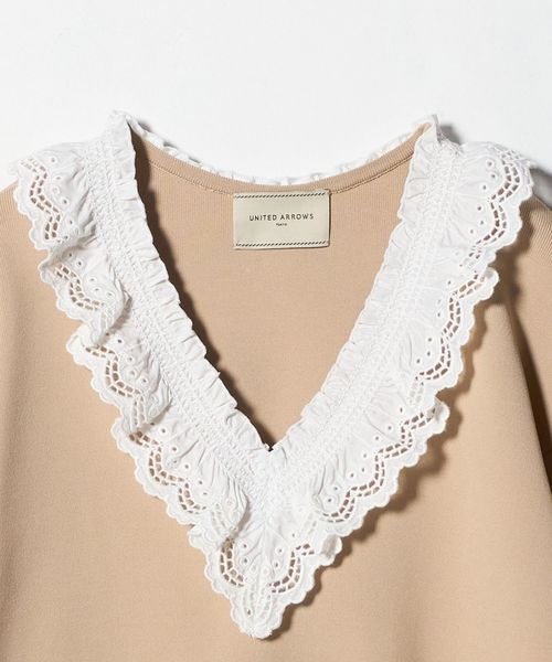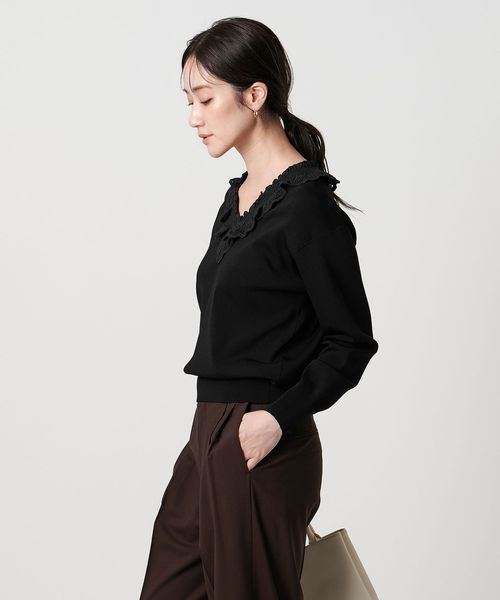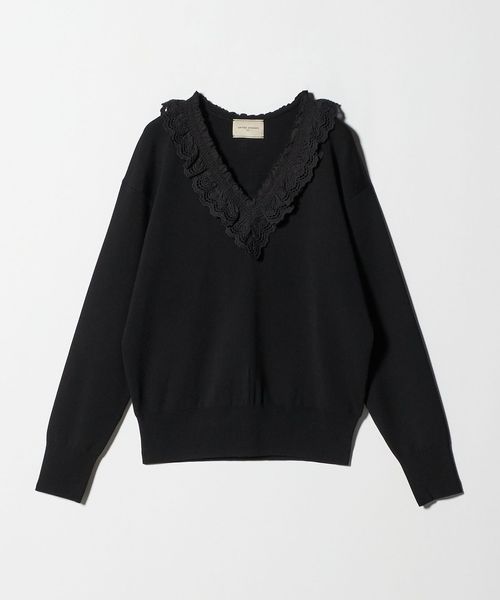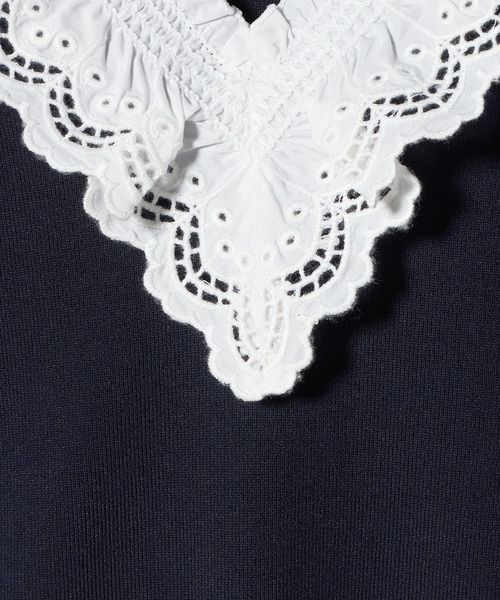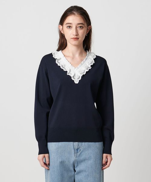 襟まわりのスカラップレースがアクセントのVネックニットトップス。