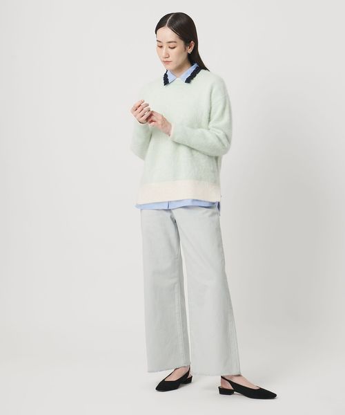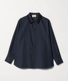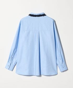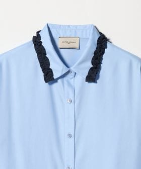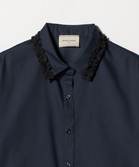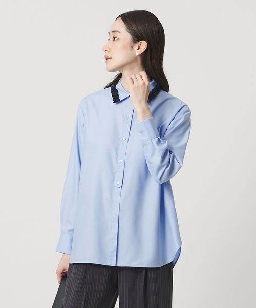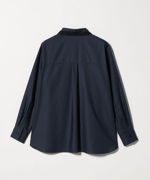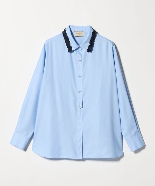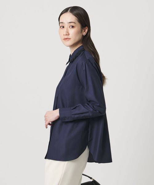 襟のフリルが顔周りを華やかに見せてくれるシャツ。