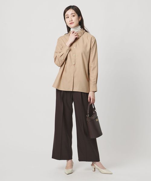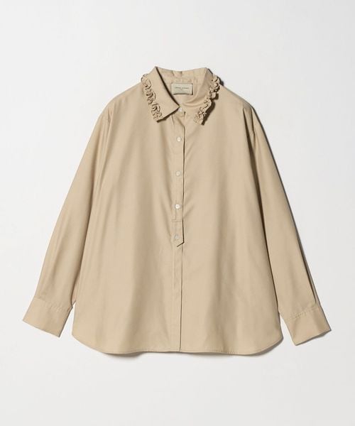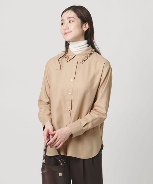 襟のフリルが顔周りを華やかに見せてくれるシャツ。