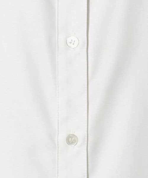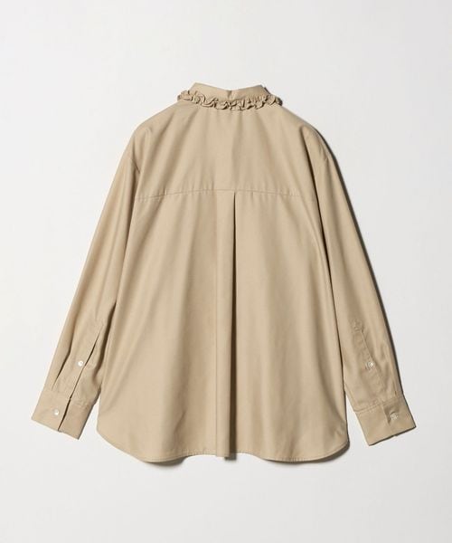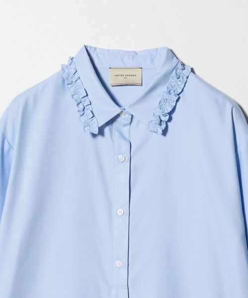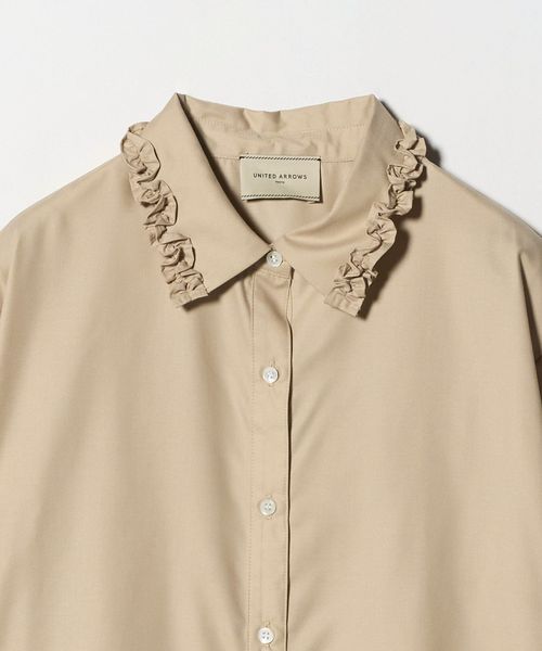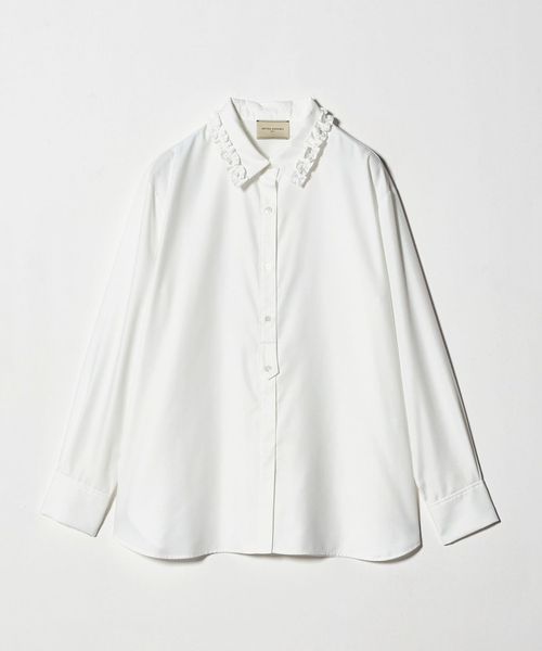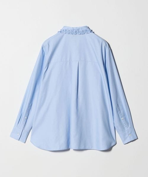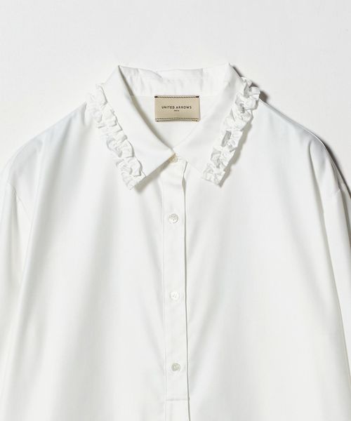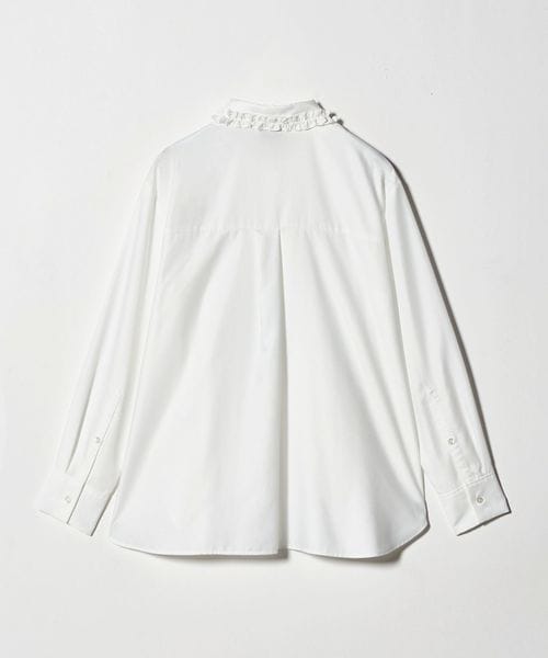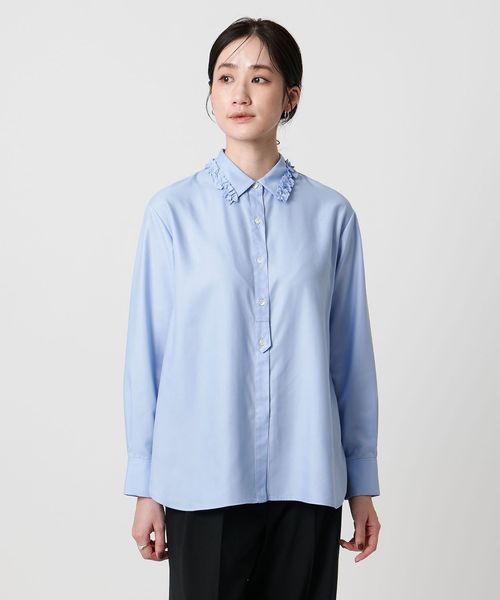 襟のフリルが顔周りを華やかに見せてくれるシャツ。