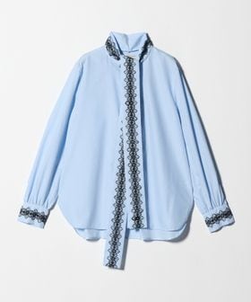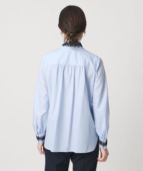 ボウタイとカフスにたたいたレースがポイントのブラウス。
