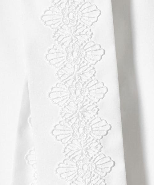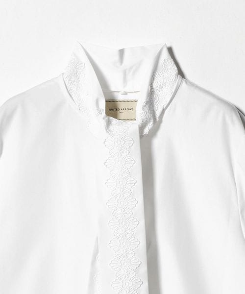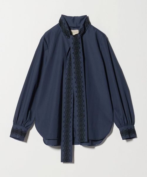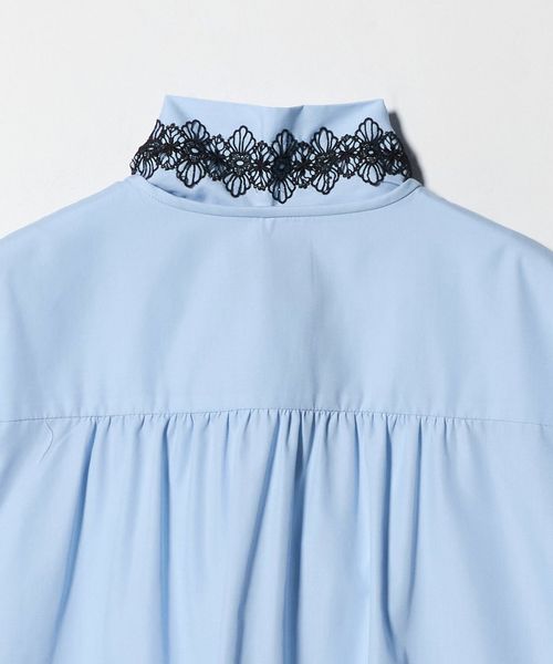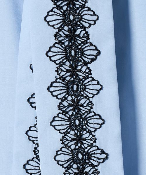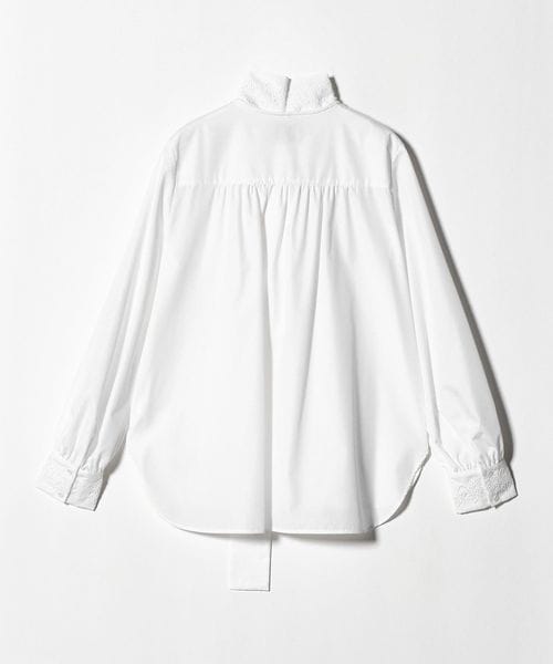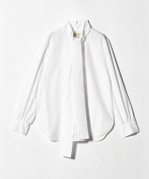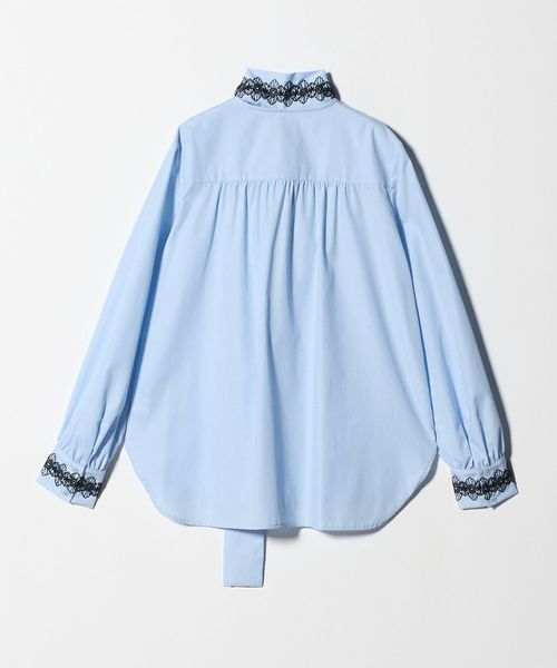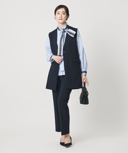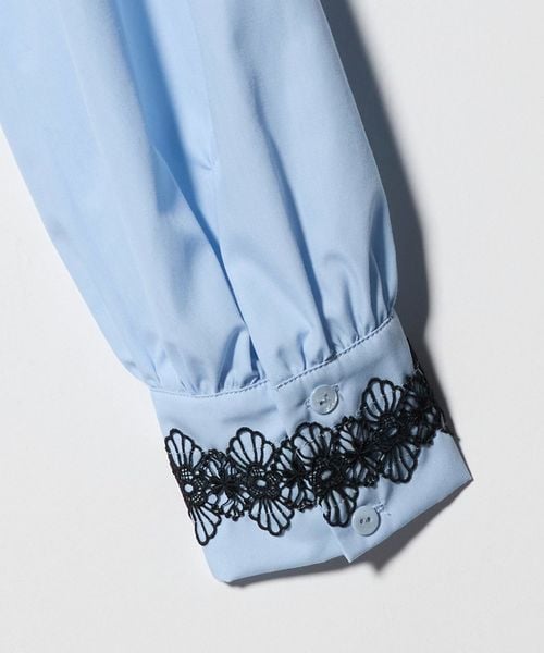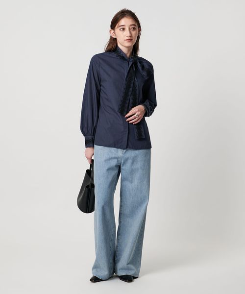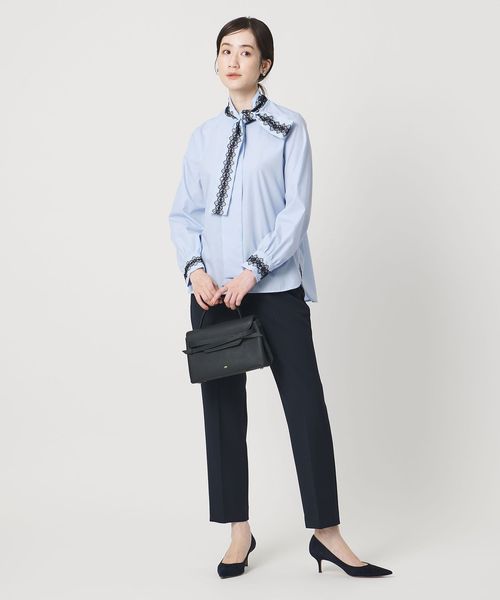 ボウタイとカフスにたたいたレースがポイントのブラウス。