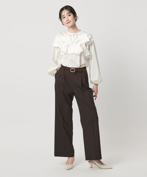 袖口にギャザーを入れたボリュームスリーブや、適度なネックの開きが女性らしい印象を演出します。