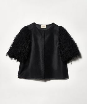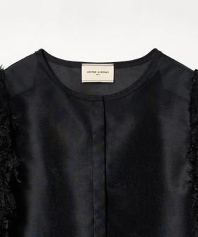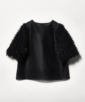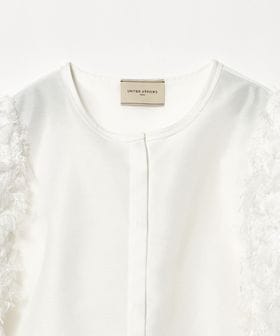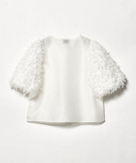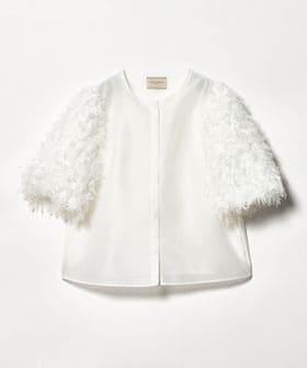 袖にだけ華やかな素材を取り入れ、身頃には透け感とハリのある生地を使用しています。