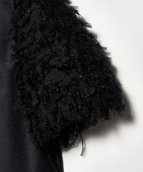 袖部分は、チュールと抄繊糸を撚糸した特殊な意匠糸で、シャーリング刺繍をほどこしファーのような毛足感を表現しました。