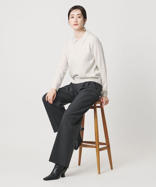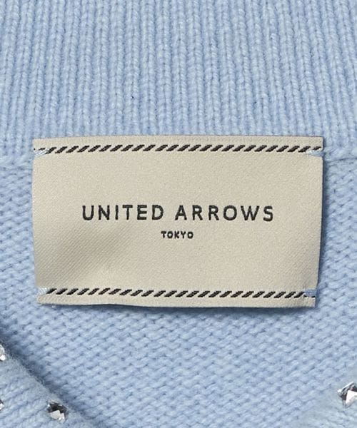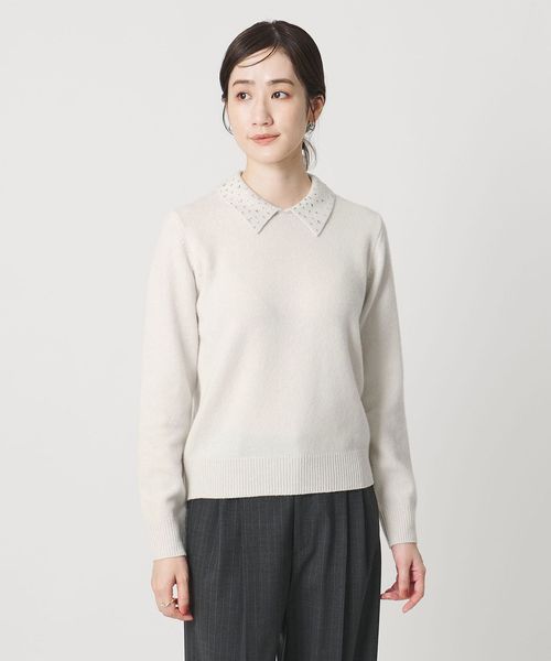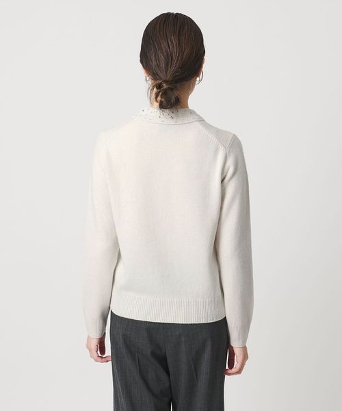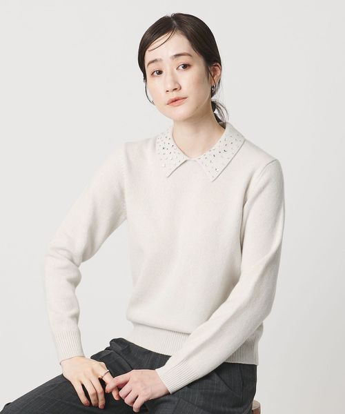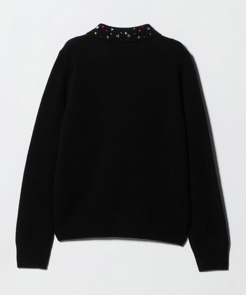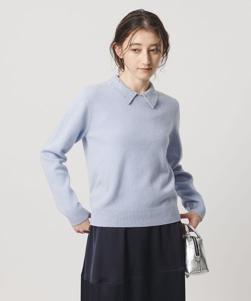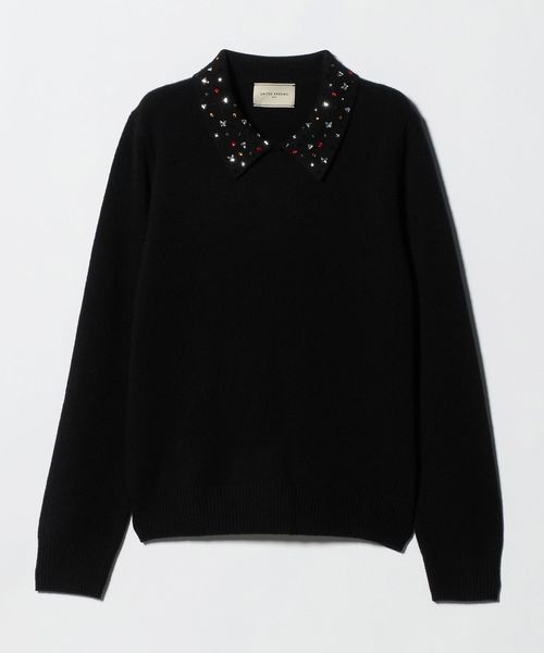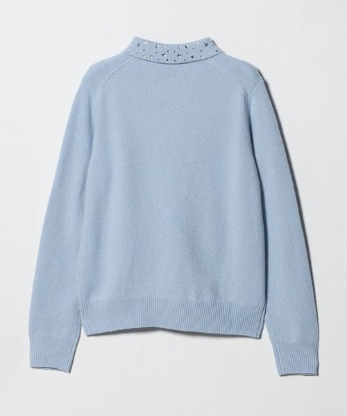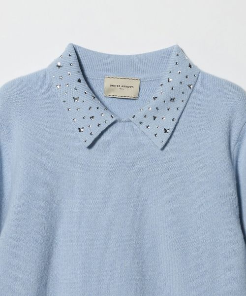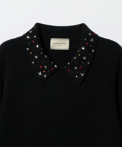 襟部分にいろいろな形のラインストーンをちりばめたニットトップス。