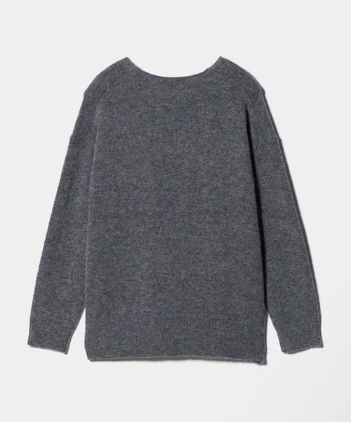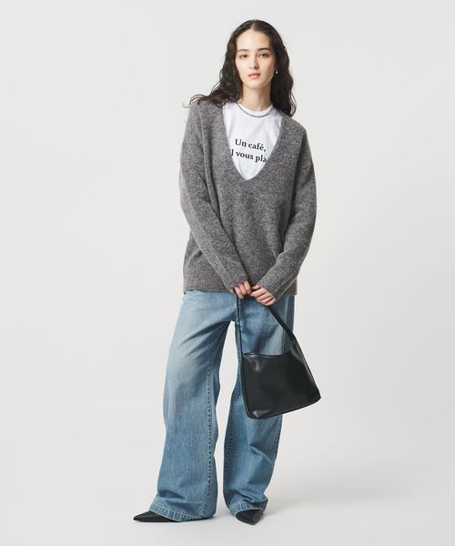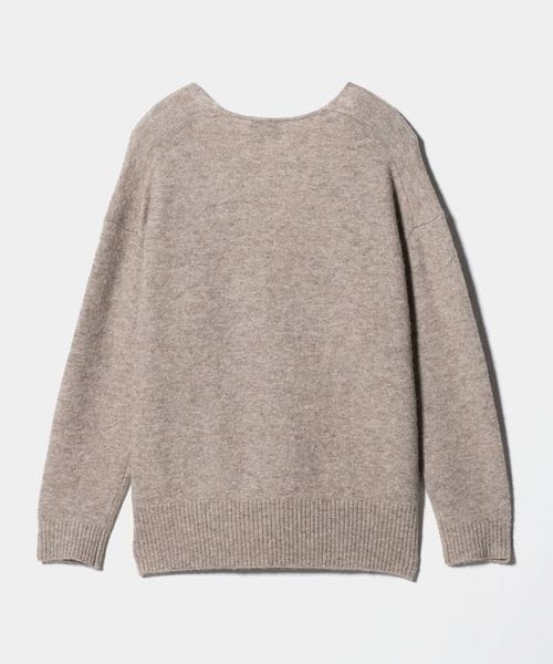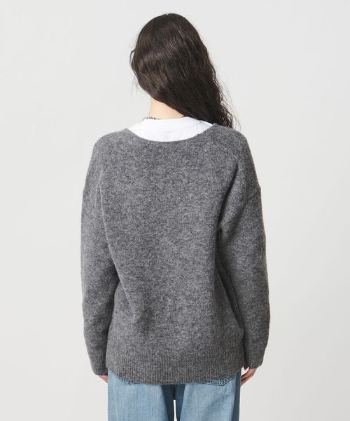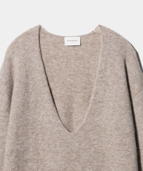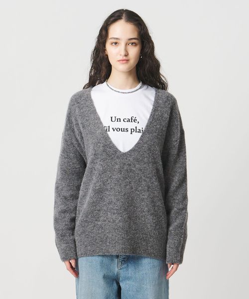 インナーとのレイヤードが映える、深めのVネックデザインのニット。