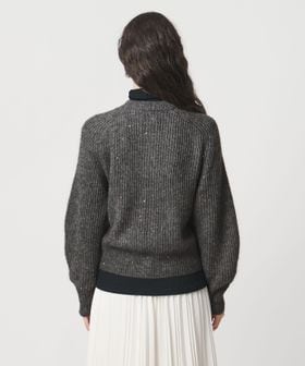 あたたかみのあるアルパカとウールを混紡した素材に、ラメ糸と選りすぐった配色の花形スパンコール糸を撚糸した素材を引き揃えた軽やかな天竺素材。