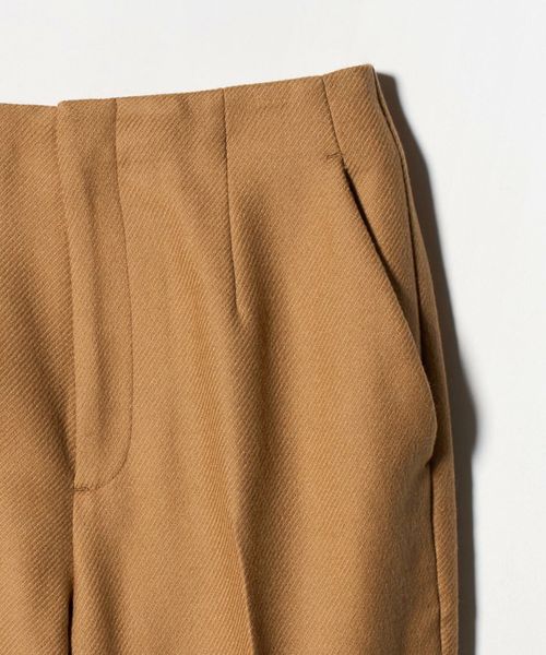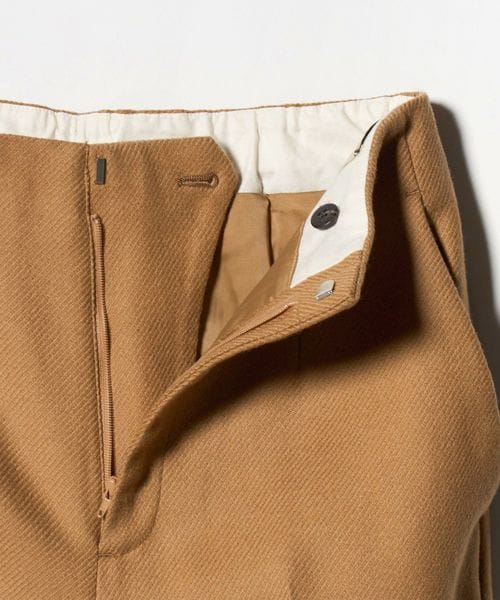 毛のパンツ地にしてはやや太めのドライタッチ梳毛糸を使用し、絶妙な肉感と光沢感を持ち合わせた、クラッシック感あるダイヤゴナル組織。