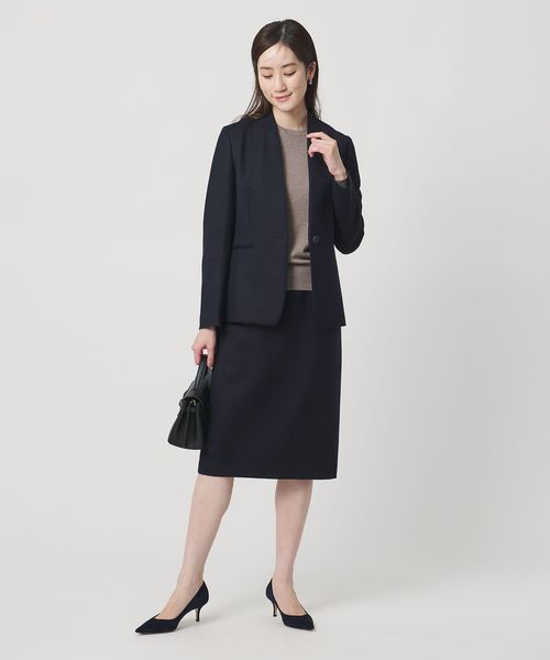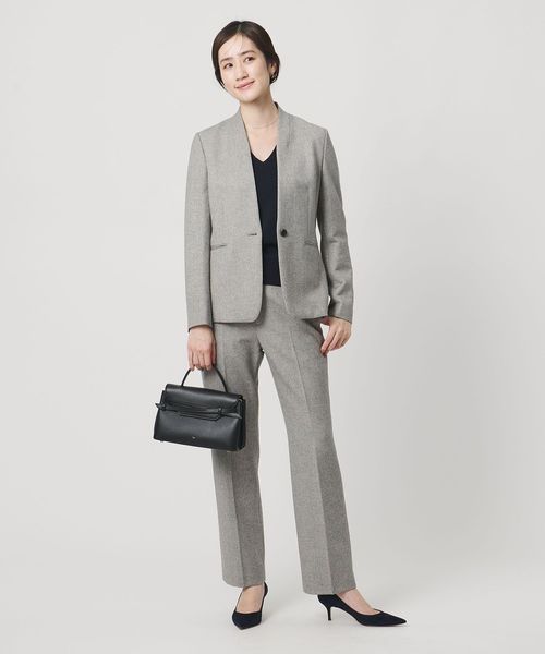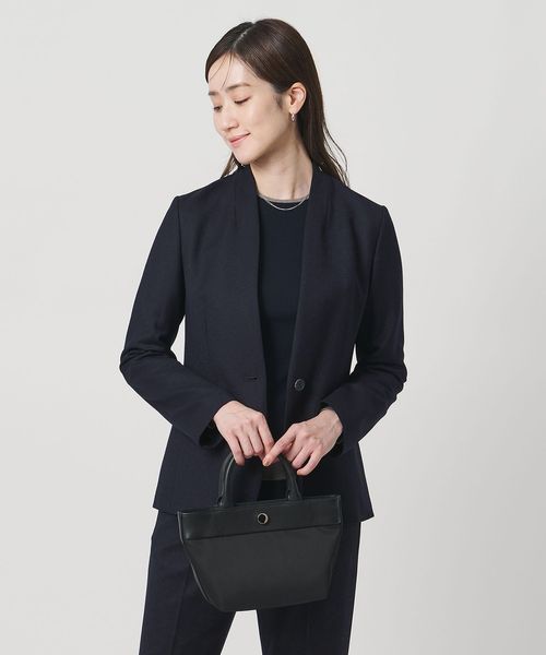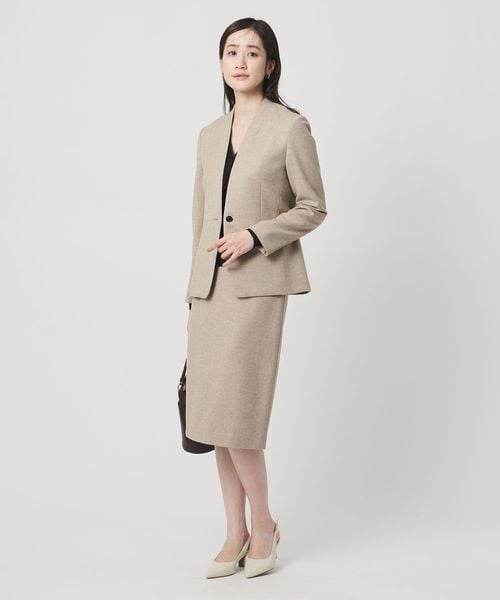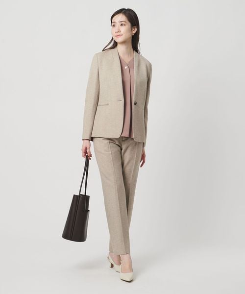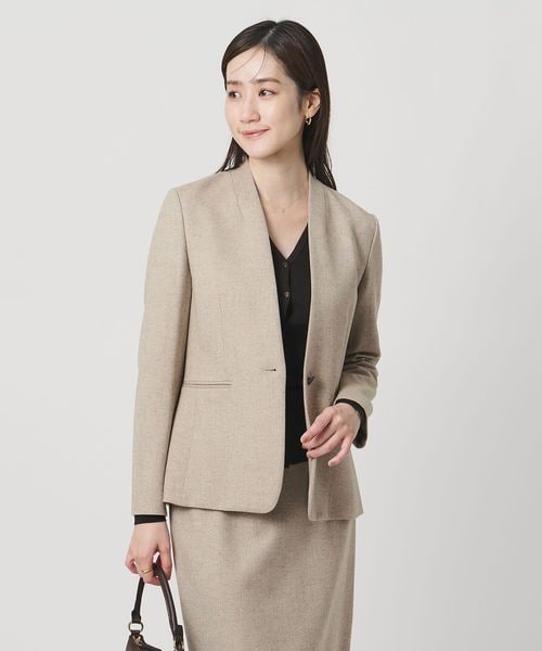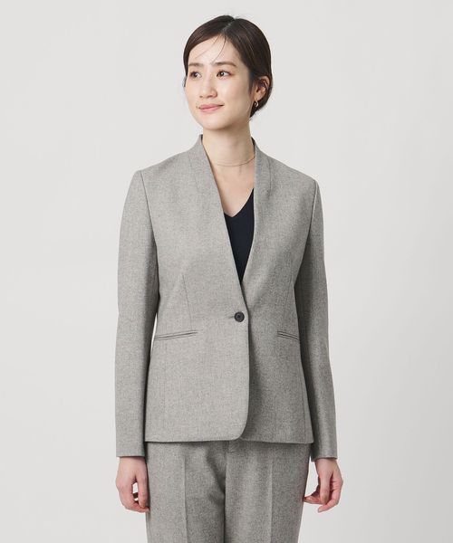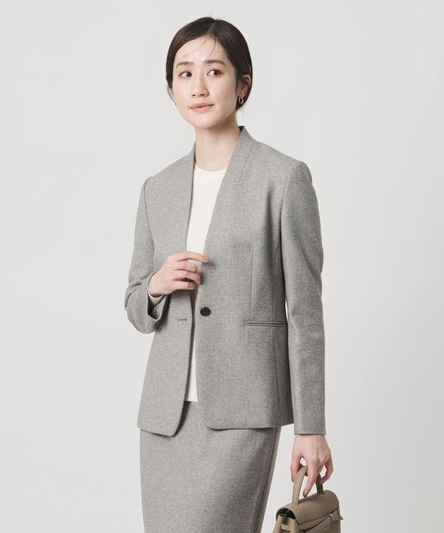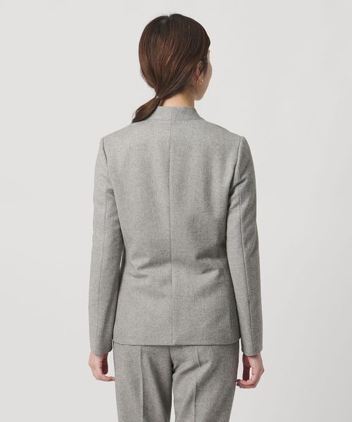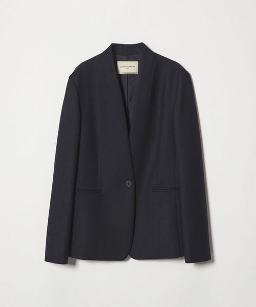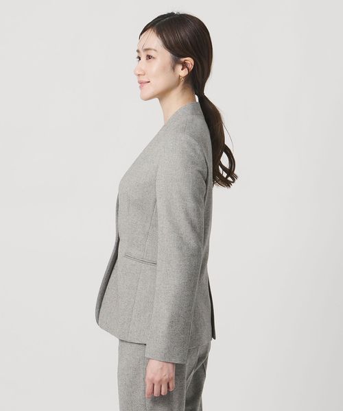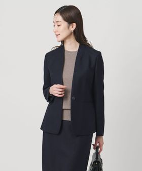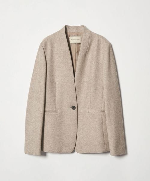 首元に沿って立ち上がるVノーカラーが、すっきりとした印象を演出するジャケット。