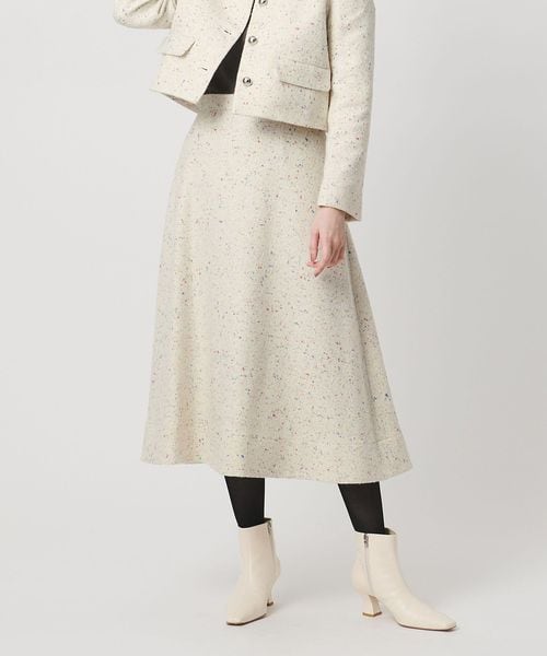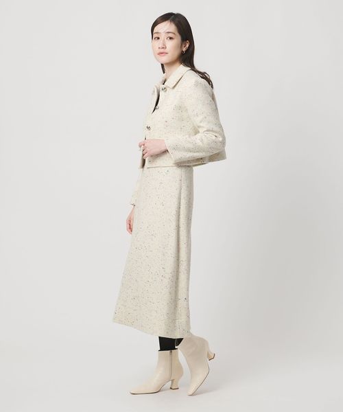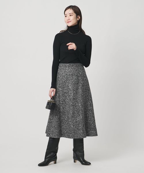 同素材展開の組上ジャケットとセットアップでの着用はもちろん、タートルネックニットを合わせた上品なスタイルもおすすめ。