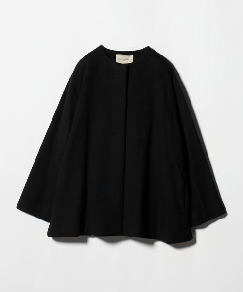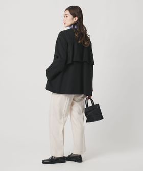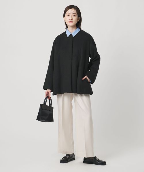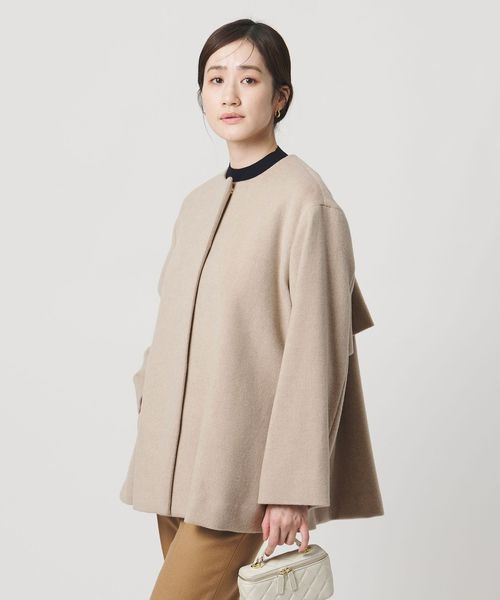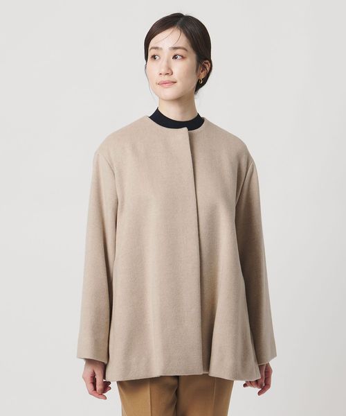立体感と華やかさのあるバックフレアディティールがポイントのノーカラーコート。