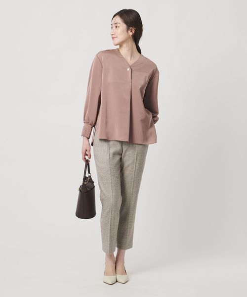 デザインブラウスやシャツはもちろん、ニットと合わせた季節感のあるコーディネートもおすすめ。