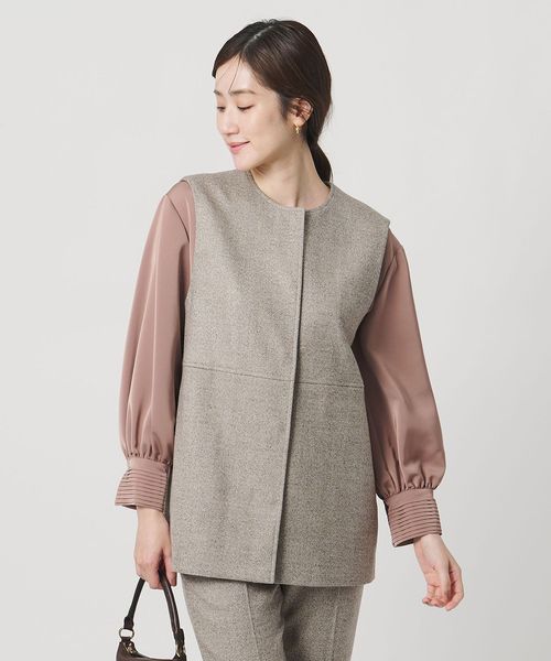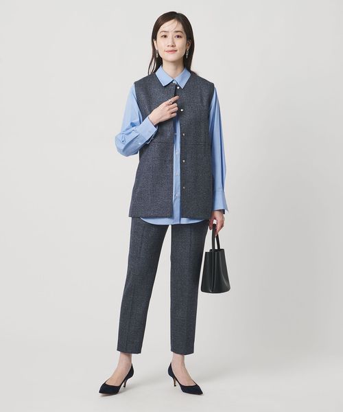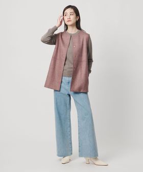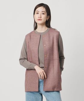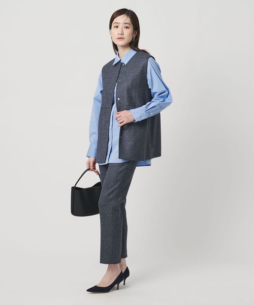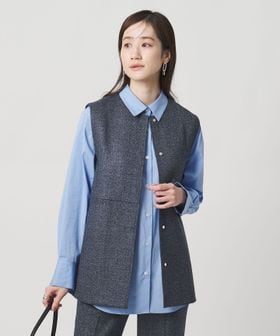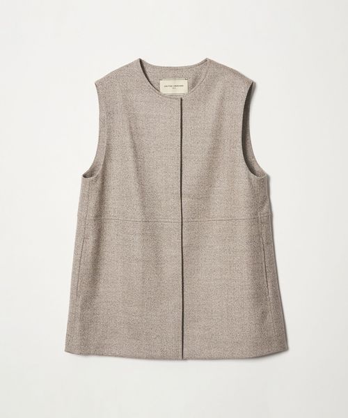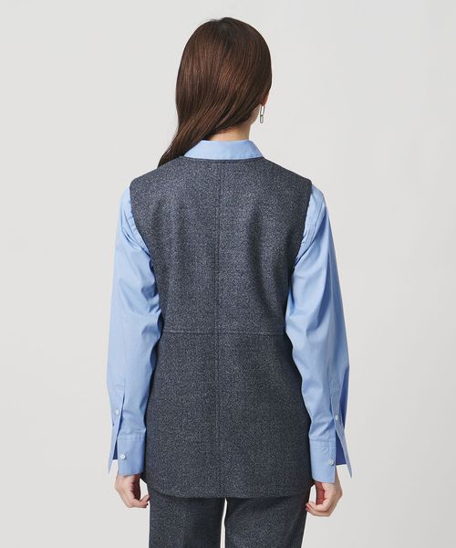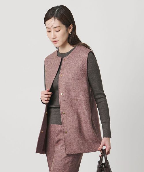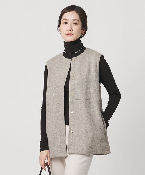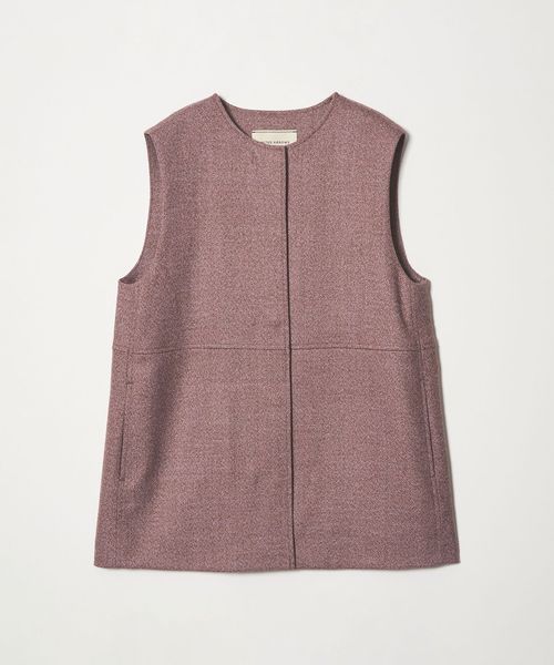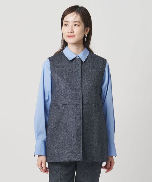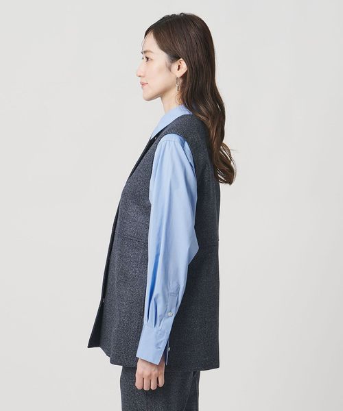 比翼仕立ての前開きにメタルドットボタンをあしらい、ミニマルながら印象的な仕上がりのベスト。